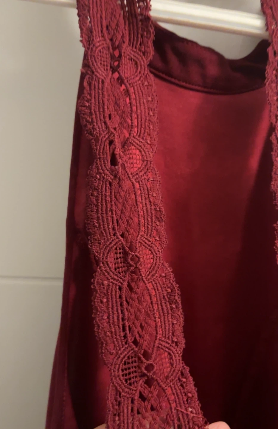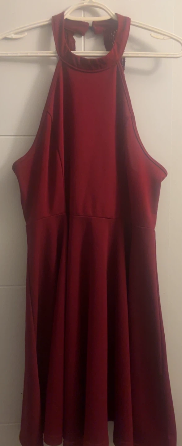 Selling a lovely burgundy halter dress! It features a flattering halter neckline and delicate lace detailing around the neck and back. Perfect for a special occasion or a night out