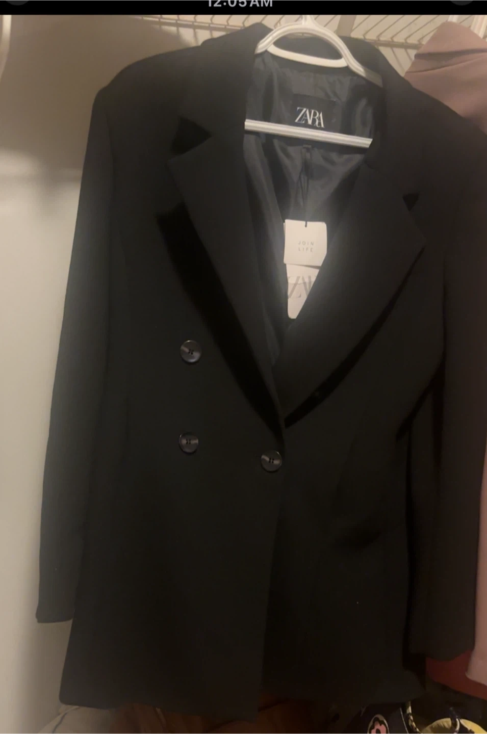 Selling a Zara black blazer in size medium. It's in great condition and ready for a new home! This stylish blazer is perfect for dressing up or down. It features a classic double-breasted design with sleek lines. A versatile addition to any wardrobe!