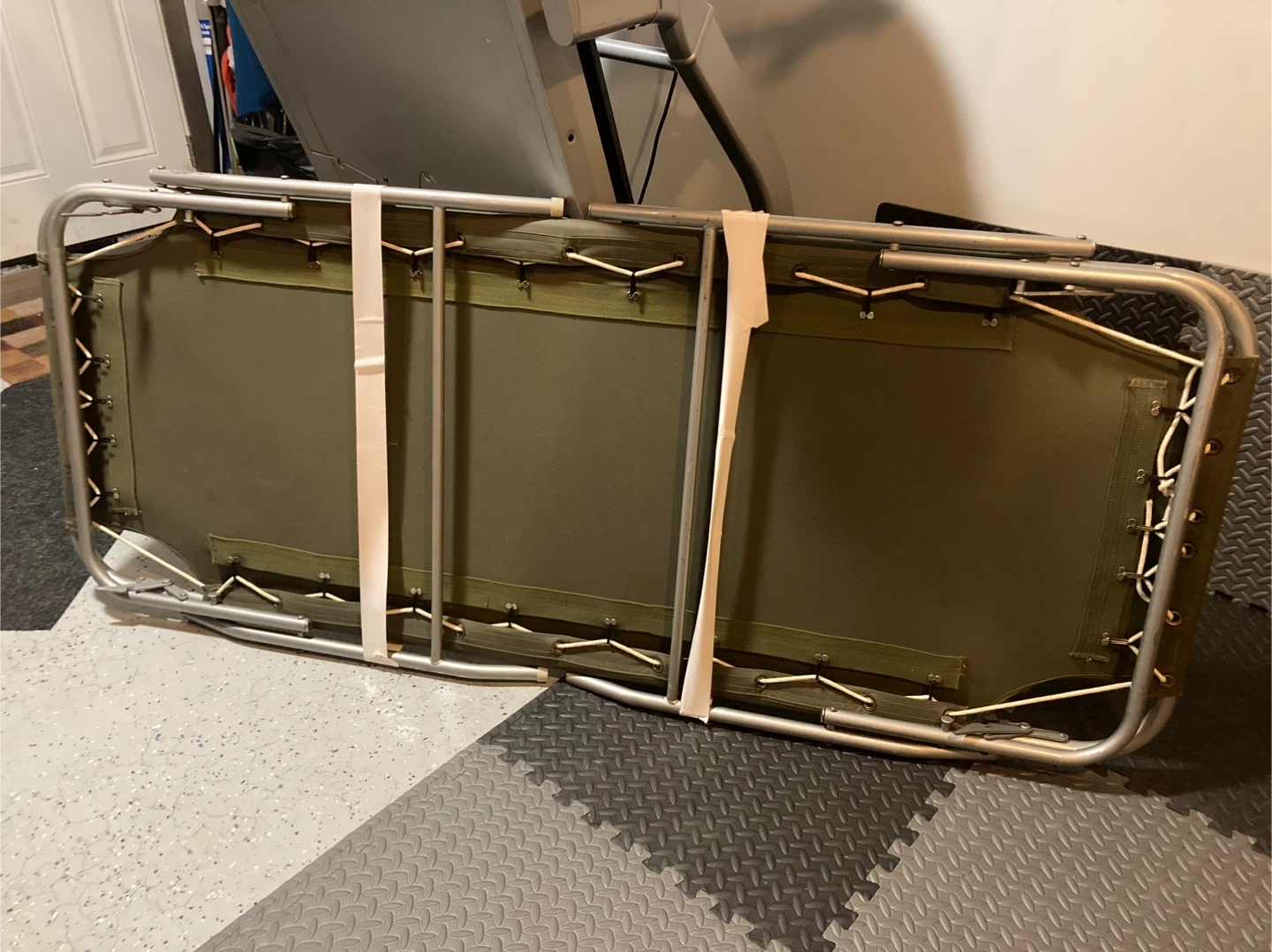 Selling a heavy duty, stretcher style camping cot in olive green. It's in great shape and ready for your next outdoor adventure. Perfect for camping, hiking, extra holiday guests, or just relaxing in the backyard! 76 inches long x 30 inches wide x 27 inches high.