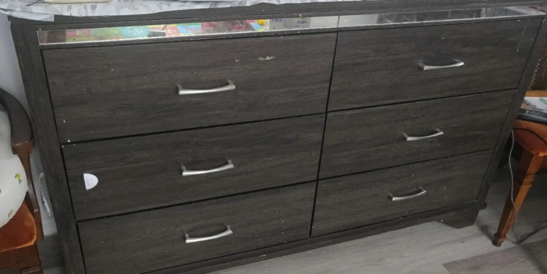 Selling a wood dresser with a matching mirror. The dresser has six drawers and the vanity mirror is a nice size for getting ready. It's a great set for adding storage and style to any bedroom!
