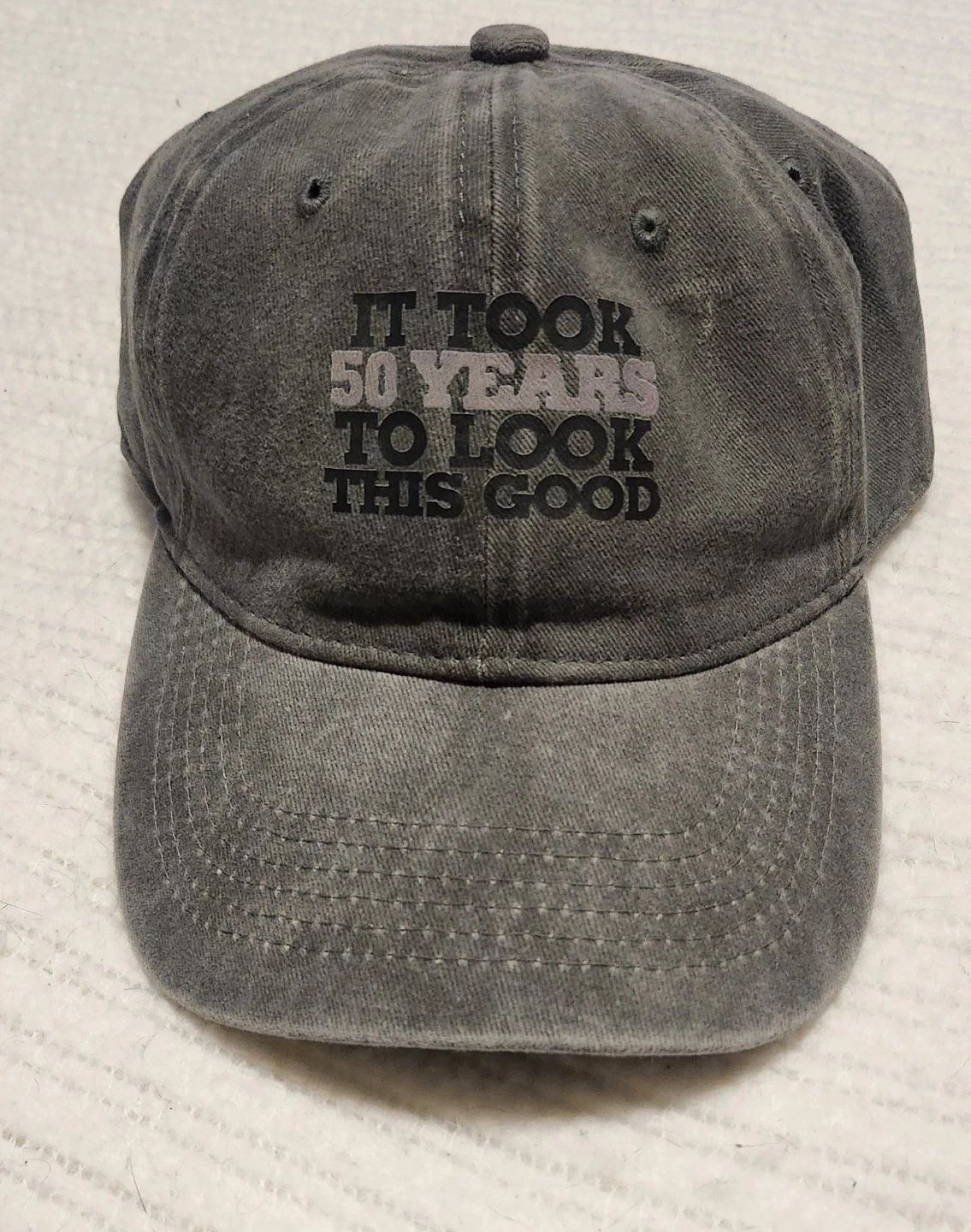 Here's a grey baseball cap made of 100% cotton! It has the fun saying "It took 50 years to look this good" printed on the front. A great casual accessory! Brand New never worn.