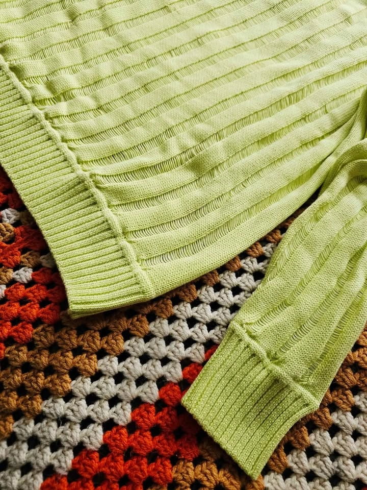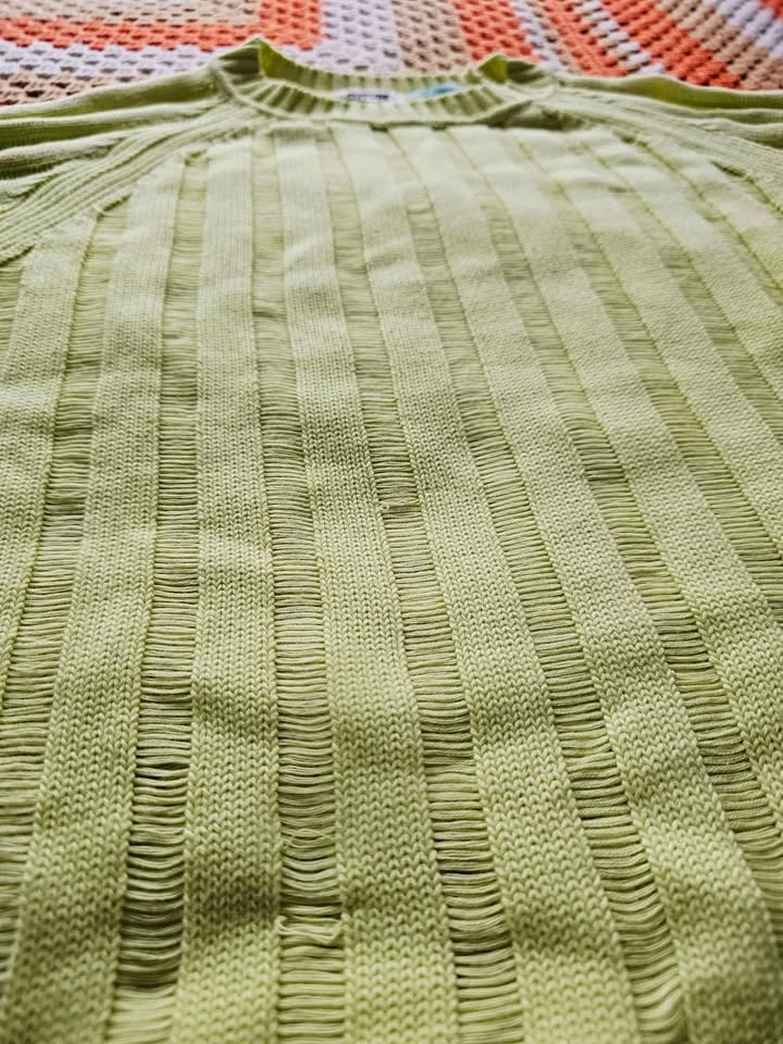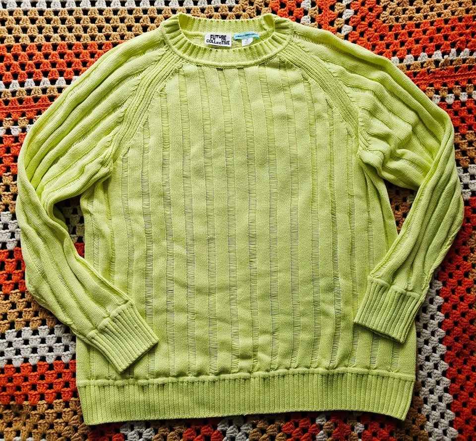 Cute 100% cotton crewneck sweater in a bright pastel lime green shade, Future Collective with Gabriella Karefa-Johnson. Sweater is made in a textured striped knit, with sections that are widely spaced and a little see-through and sections that are tightly knit. Pair with baggy jeans for a 90s/ Y2K grunge vibe!