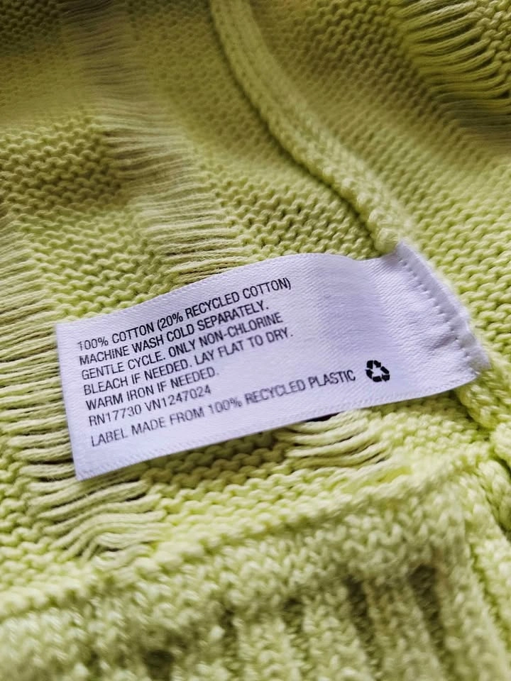 Sweater is in good used condition. There are some minor pulls in some of the loosely knit stripes but no damage. Sweater is a size Medium and is meant to fit somewhat loose. It is made with 20% eco-friendly recycled cotton.