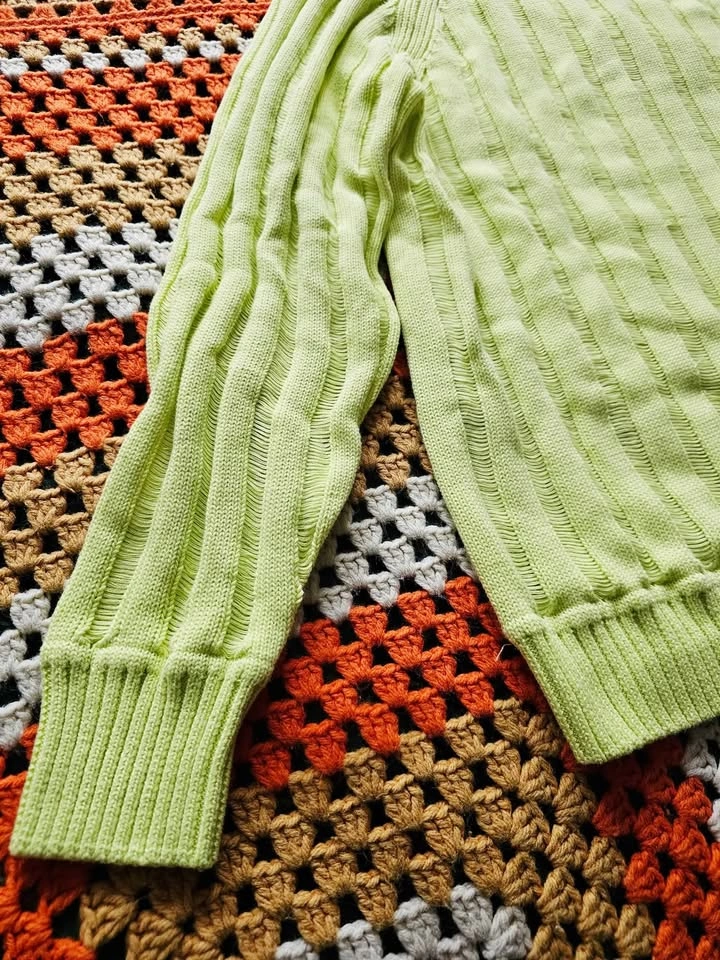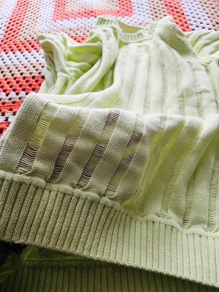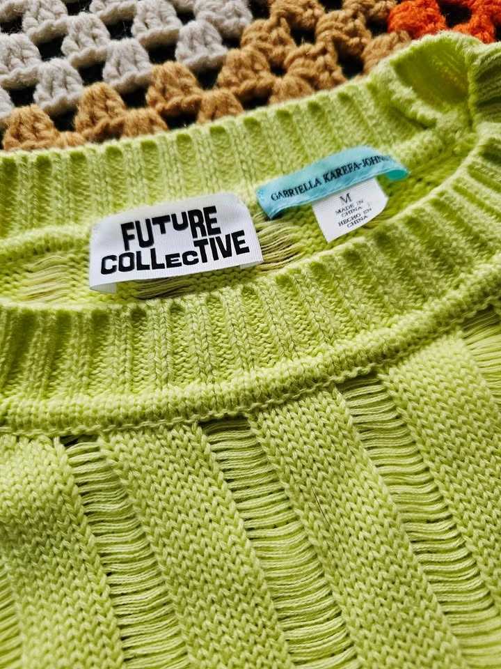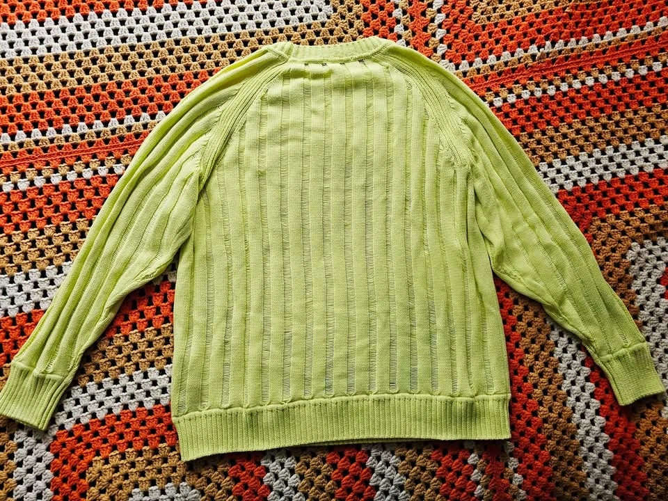 Cute 100% cotton crewneck sweater in a bright pastel lime green shade, Future Collective with Gabriella Karefa-Johnson. Sweater is made in a textured striped knit, with sections that are widely spaced and a little see-through and sections that are tightly knit. Pair with baggy jeans for a 90s/ Y2K grunge vibe!