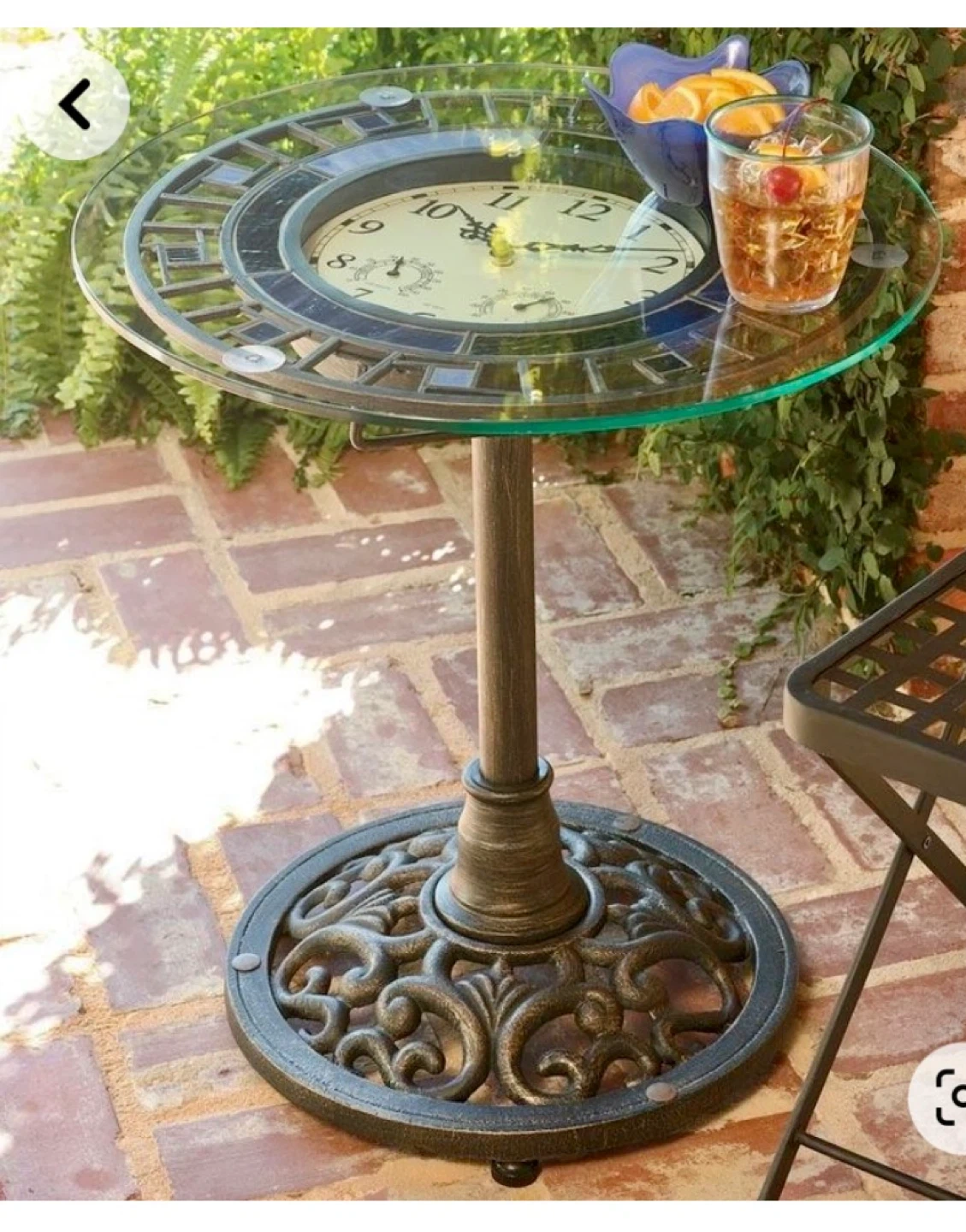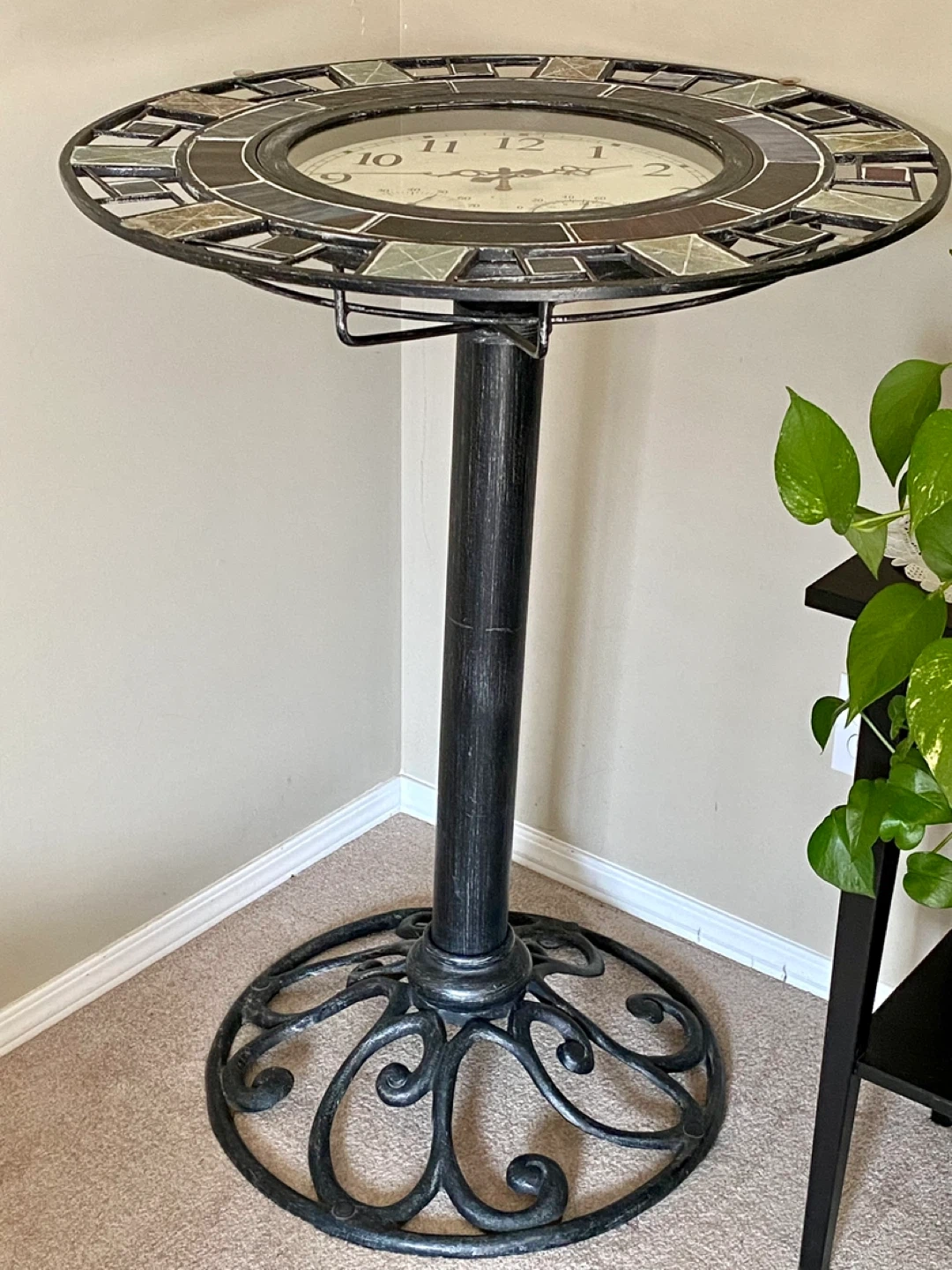 Selling a unique mosaic clock accent table! It features a functional clock face surrounded by a mosaic design. The base is made of wrought iron with a decorative scroll design. Perfect for adding a touch of charm to any room. Itβs a little bit wobbly if u can fix it.