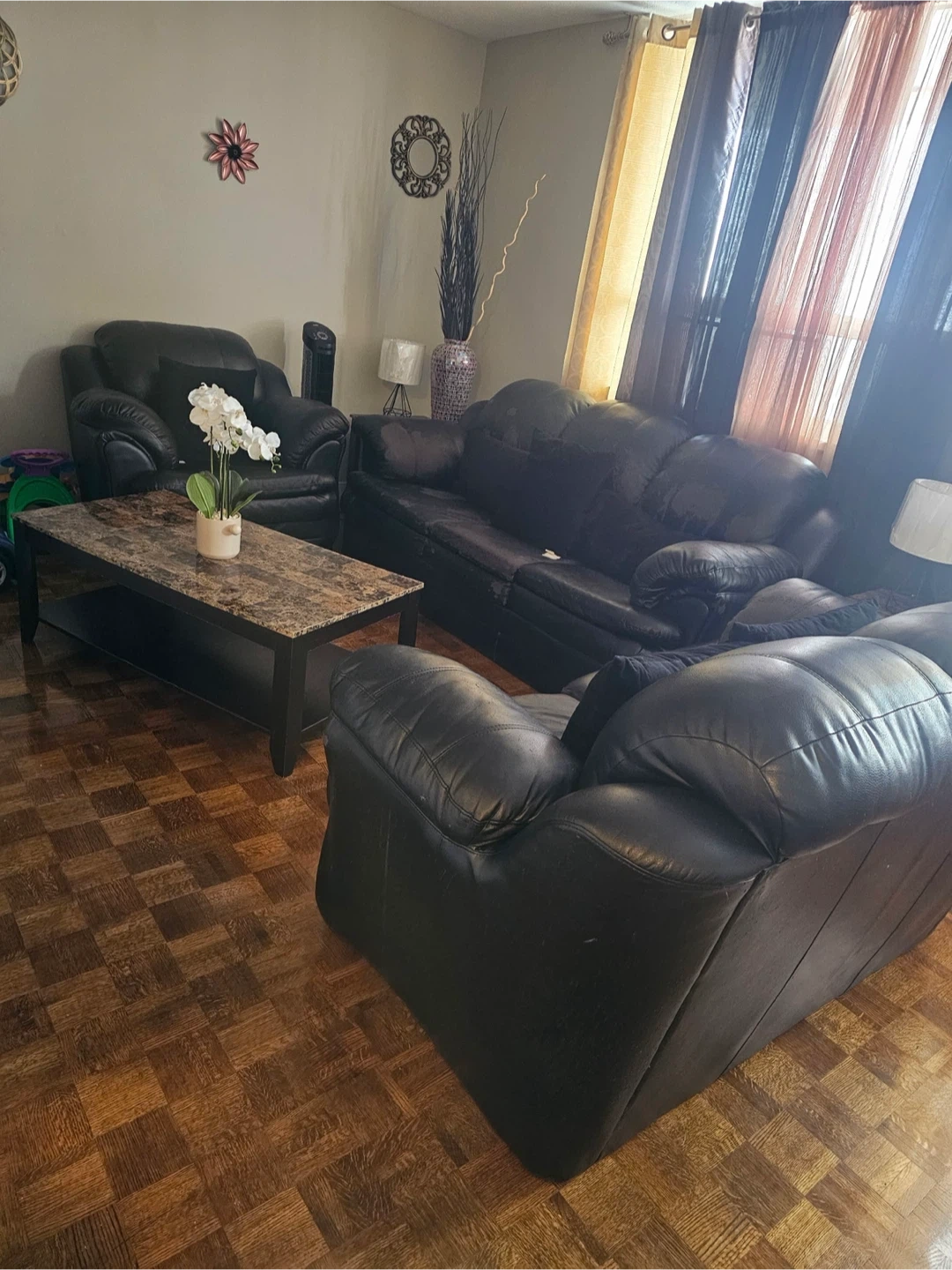 Selling a comfy black leather sofa set! It includes a sofa and two armchairs. It's in good condition,where the 2 and 3 seater is peeling a little.It also comes with 1 coffee table and 2 side tables.