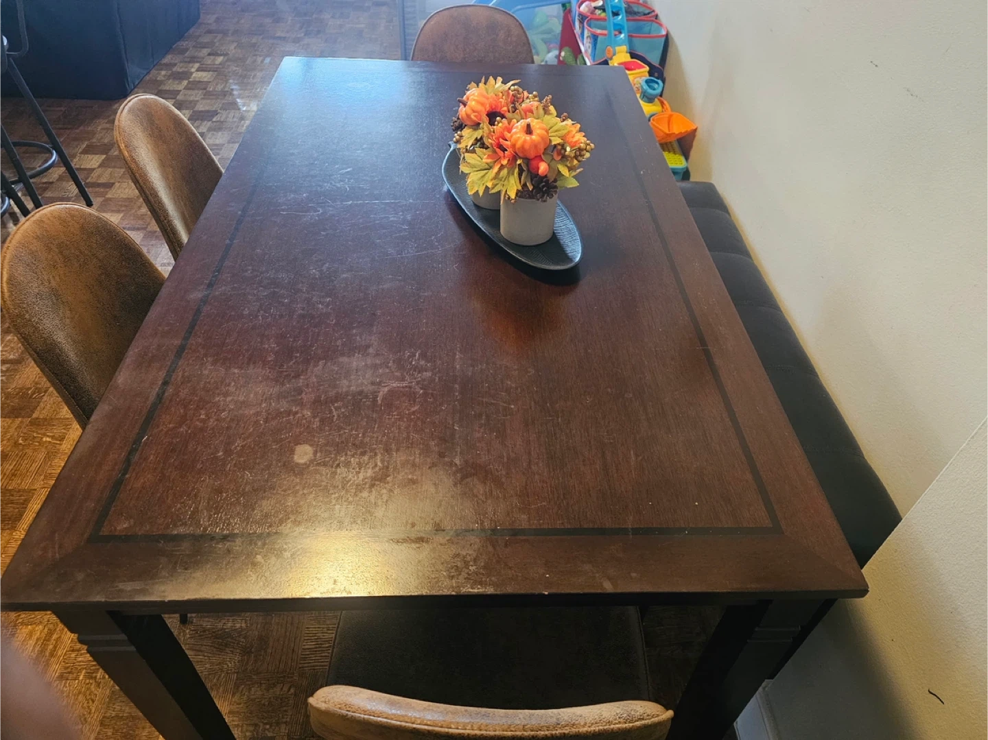 Selling a used dining table set that includes chairs and a bench. The table is a dark wood colour and shows some signs of wear. Perfect for a family or someone who likes to entertain!