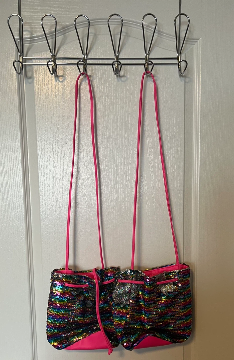 These are fun and colourful sequin drawstring bucket bags! It features rainbow sequins and a bright pink drawstring and lining. It's perfect for adding a pop of colour to any outfit.