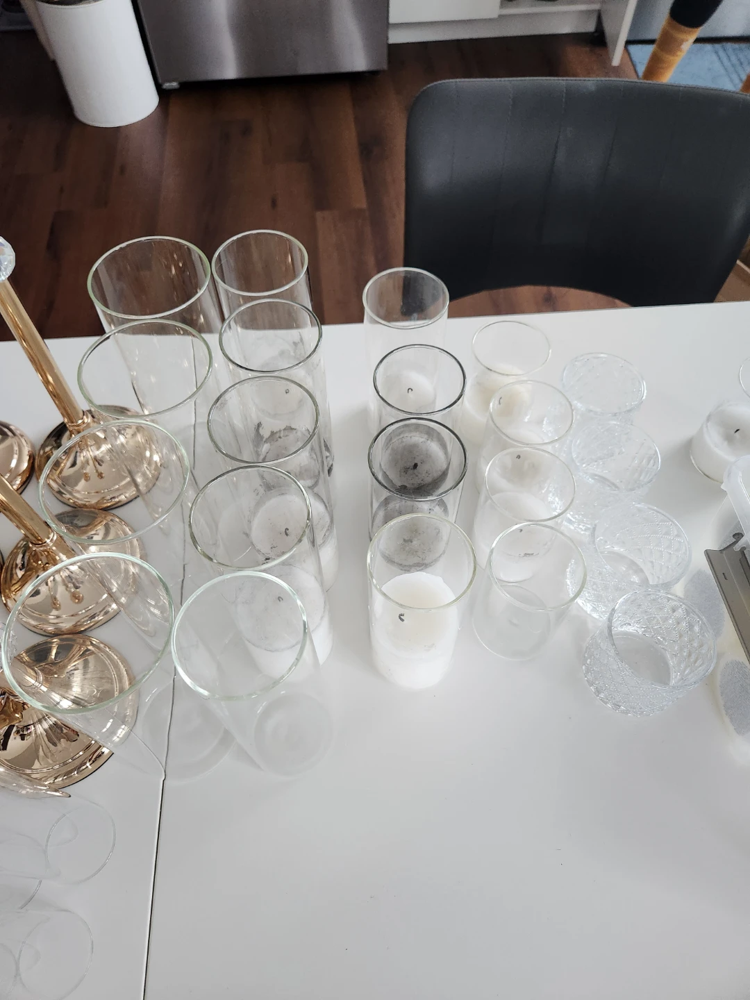 Selling a variety of candle holders and vases! There's a mix of clear glass vases, some with a cylindrical shape, and decorative candle holders with gold-coloured bases. They're perfect for adding a touch of elegance to any room or event