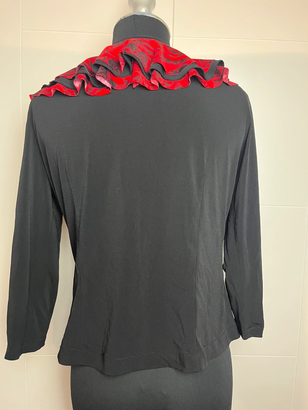 This is a stylish black long-sleeve top featuring vibrant red floral ruffles. It's in great condition and ready to add a touch of flair to your wardrobe. The material is soft and comfortable, perfect for everyday wear or a special occasion!