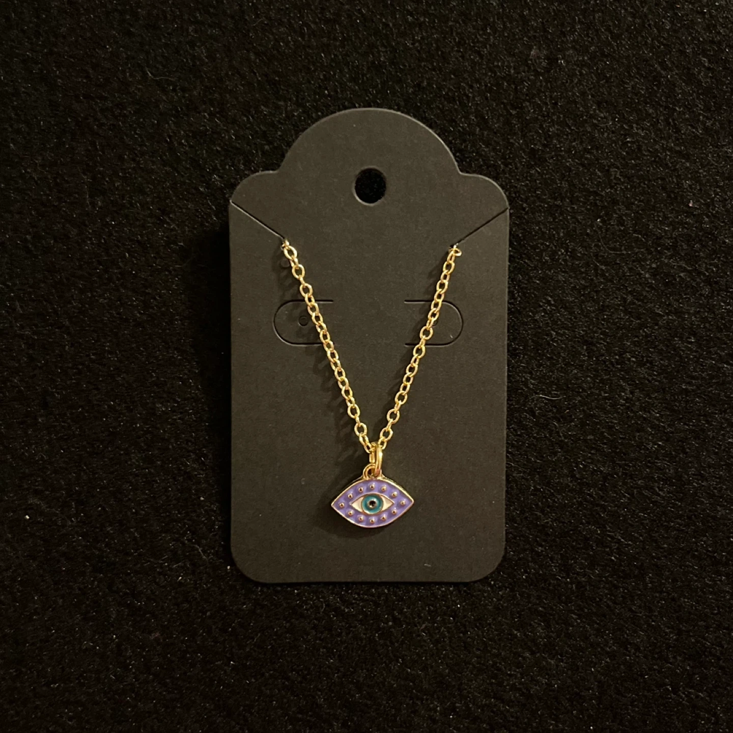 Selling a cute 14k gold chain choker necklace with an evil eye pendant! The pendant has a light purple background with a blue eye in the centre. A simple accessory to add to any outfit!