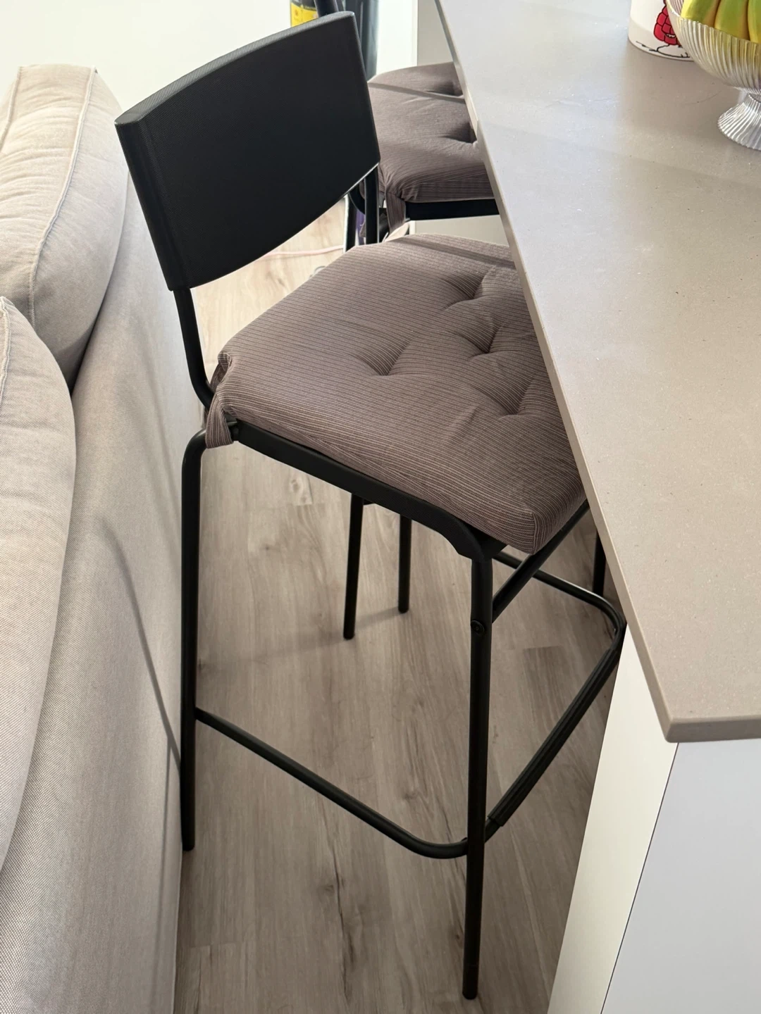 Selling a set of two bar stools! They feature a sleek black metal frame and comfy brown cushioned seats. Perfect for adding extra seating to your kitchen island or bar area. In good condition!