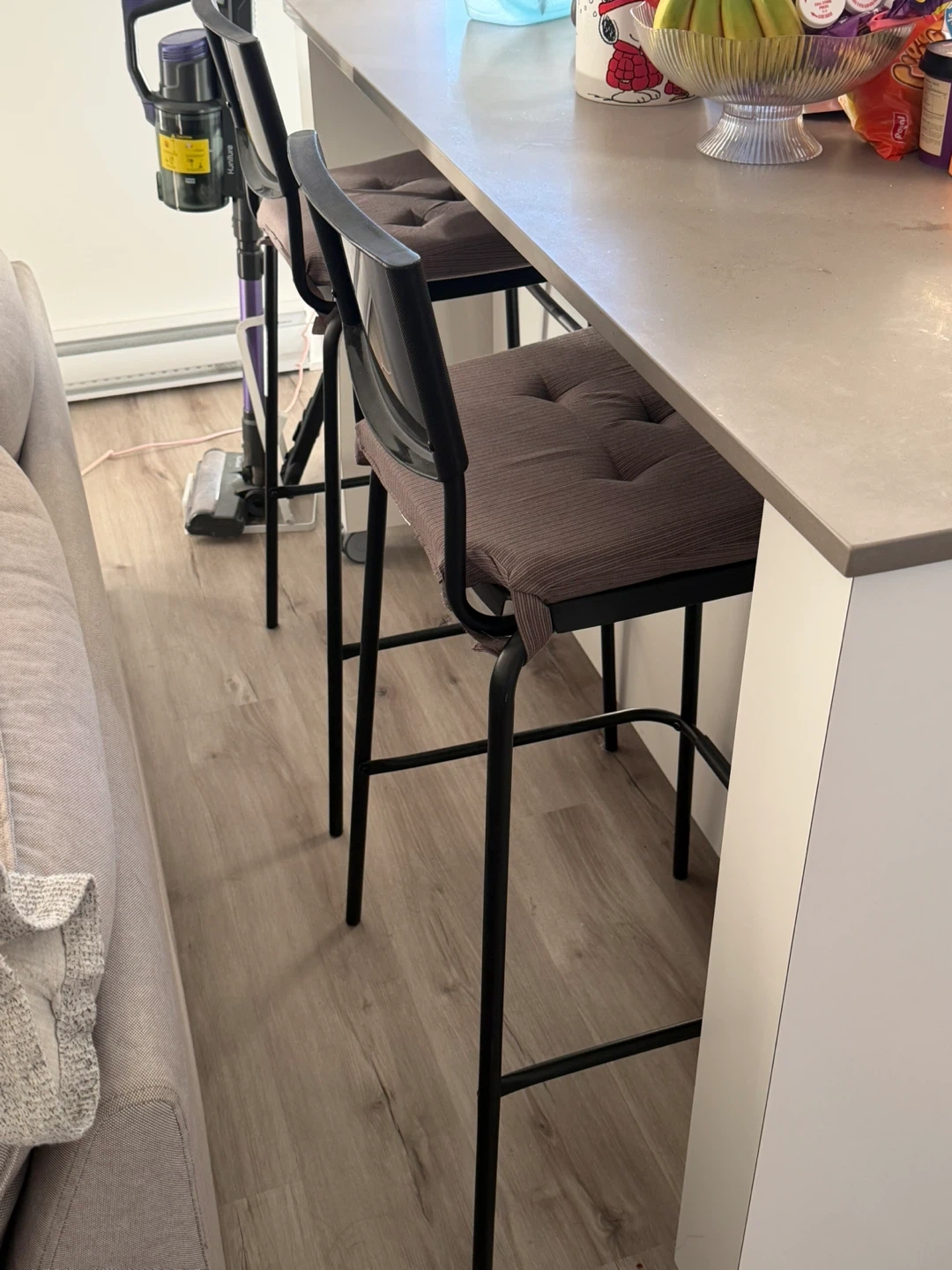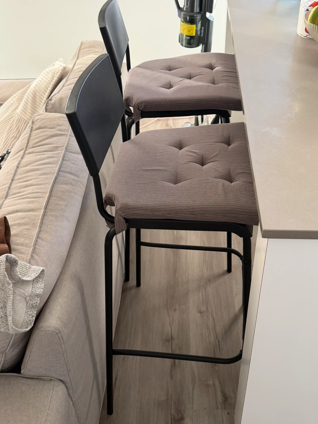 Selling a set of two bar stools! They feature a sleek black metal frame and comfy brown cushioned seats. Perfect for adding extra seating to your kitchen island or bar area. In good condition!