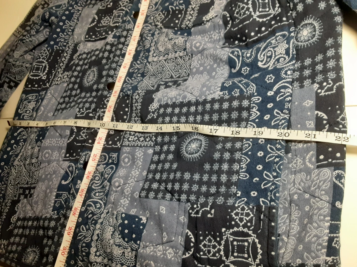 Lucky Brand, dark blue/white bandana pattern, patchwork/quilt style large(see images for measurements) jacket. A stylish and unique piece to add to your wardrobe. Featuring a button-down style, two chest pockets and two regular but large side pockets. Shell: 100% cotton, Lining: 100% cotton, Filling: 100% polyester. In excellent condition.