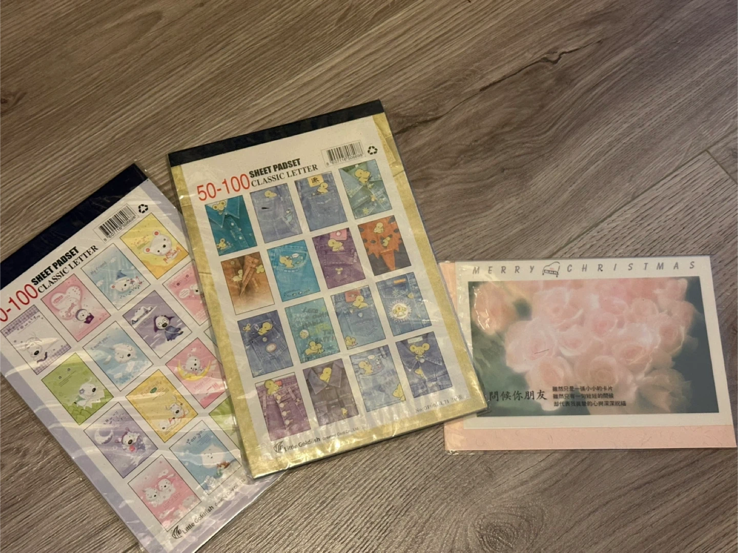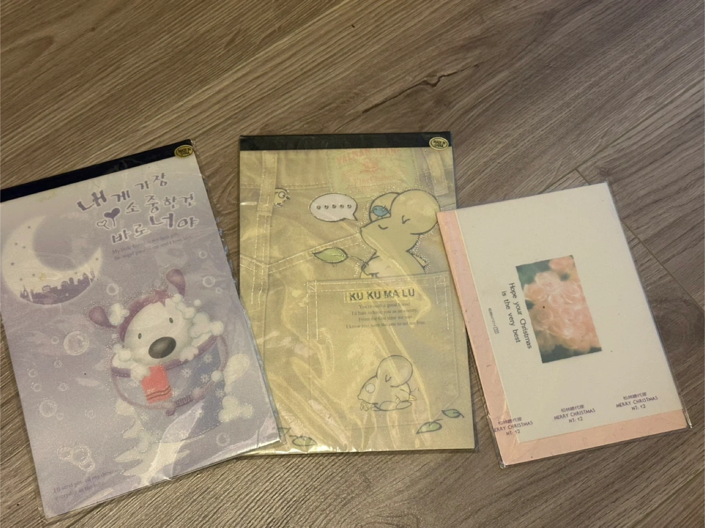 Selling a cute stationery set! Includes two sheet padsets (50-100 sheets per pad) with adorable character designs and a sweet 'Merry Christmas' card.