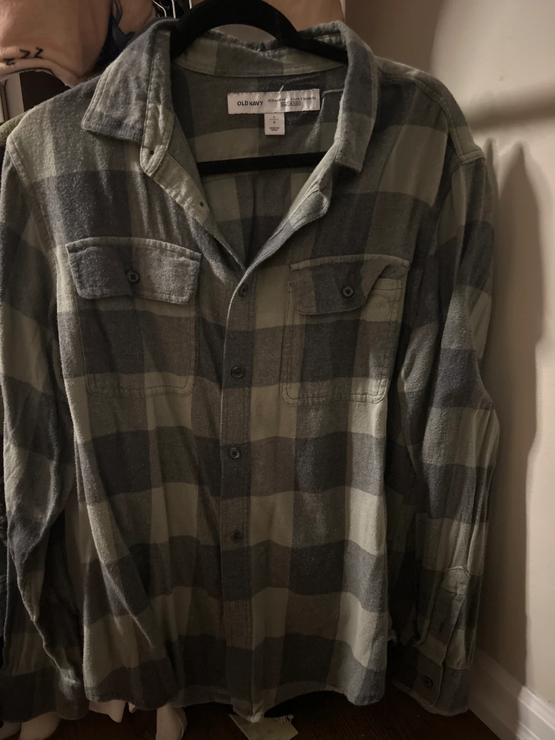 Selling a comfy Old Navy flannel shirt in size L. It features a classic plaid pattern in shades of grey and green. Perfect for layering or wearing on its own!
