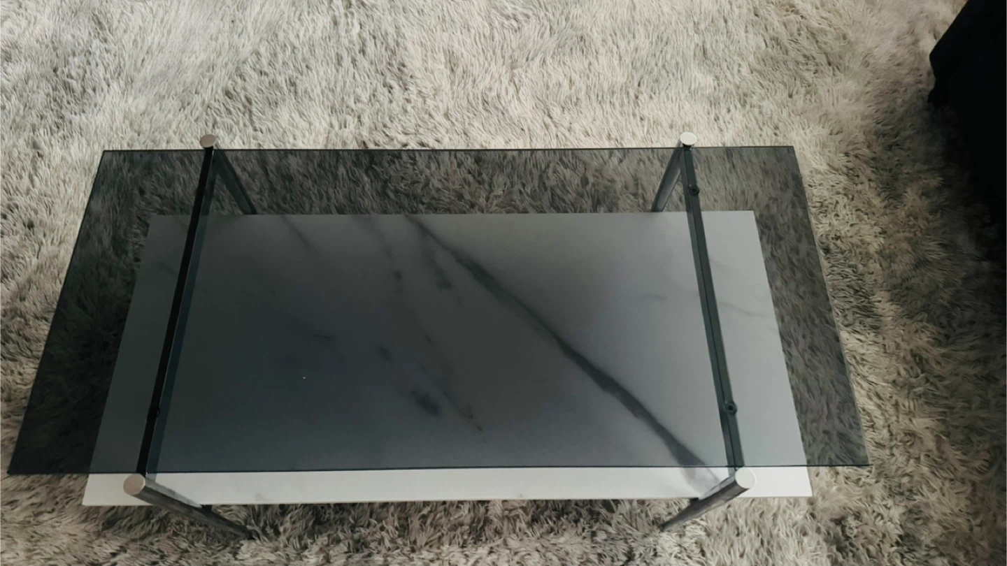 Selling a modern-style coffee table with a glass top and a faux-marble shelf underneath. It's in great condition and would look lovely in any living room. The sleek design features clean lines and a minimalist aesthetic, perfect for adding a touch of elegance to your space