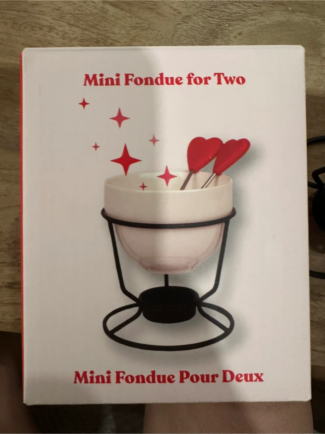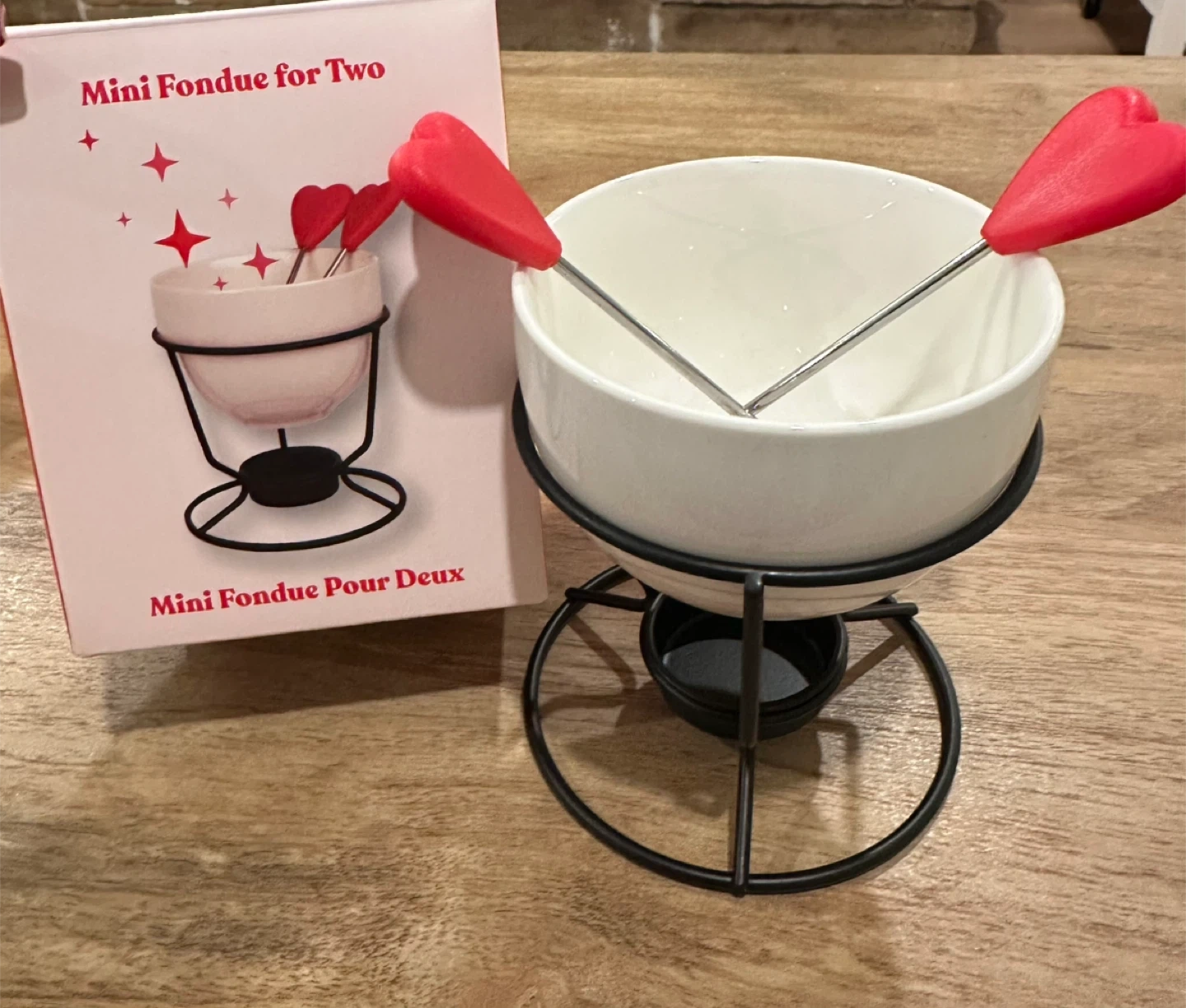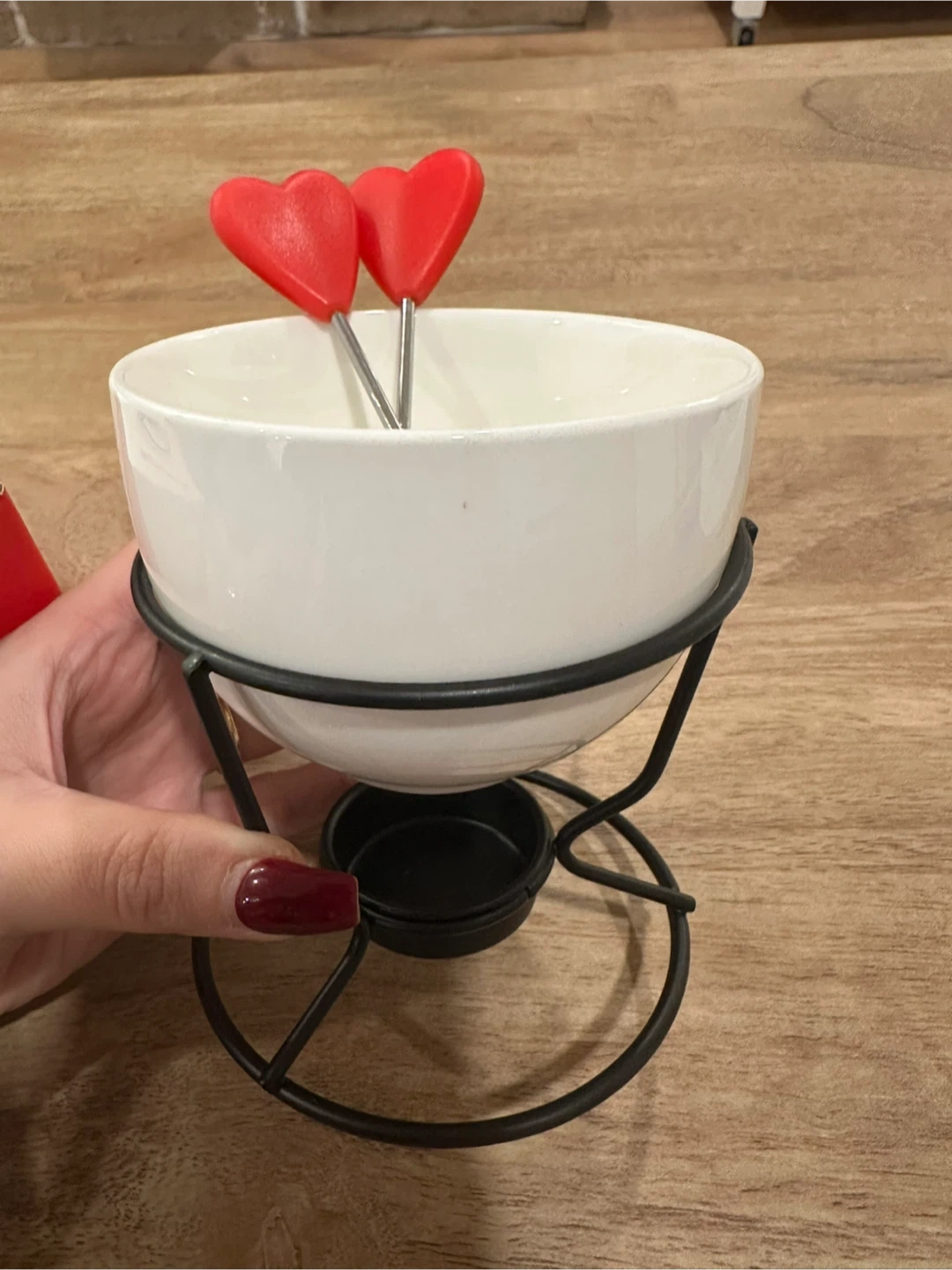 71Enjoy a cozy night in with this adorable mini fondue set from Indigo x Hobbry! Perfect for sharing a sweet, dipped dessert with your favourite person. Includes a ceramic bowl, metal stand, tea light holder, and two fondue forks with heart-shaped handles. Brand new in the Box!