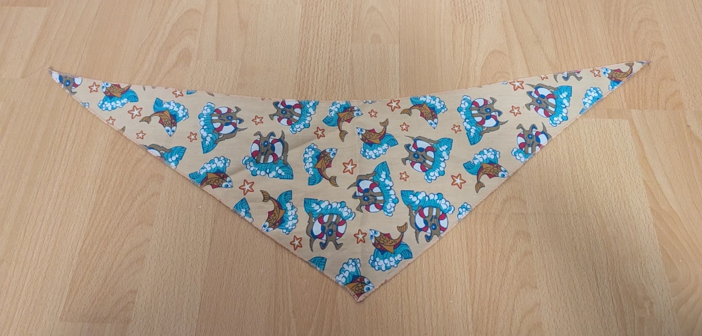 614Here's a cute bandana with a fun pattern! It features fish, stars, and little doggies in life preservers on a beige background