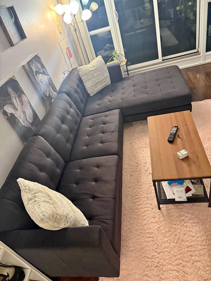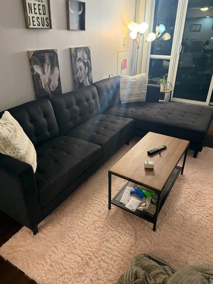 Selling this cozy dark grey sectional couch with right-side chaise. It’s super comfortable and fits perfectly in condos or apartments. The fabric is soft yet durable, and the tufted design gives it a clean, modern look.