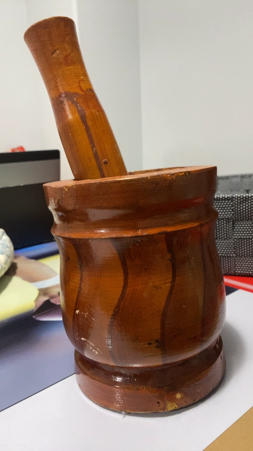 Selling a wooden mortar and pestle set. It's perfect for grinding herbs and spices in the kitchen. It shows some signs of use but is still in good working condition. Used for 2 weeks and not daily!