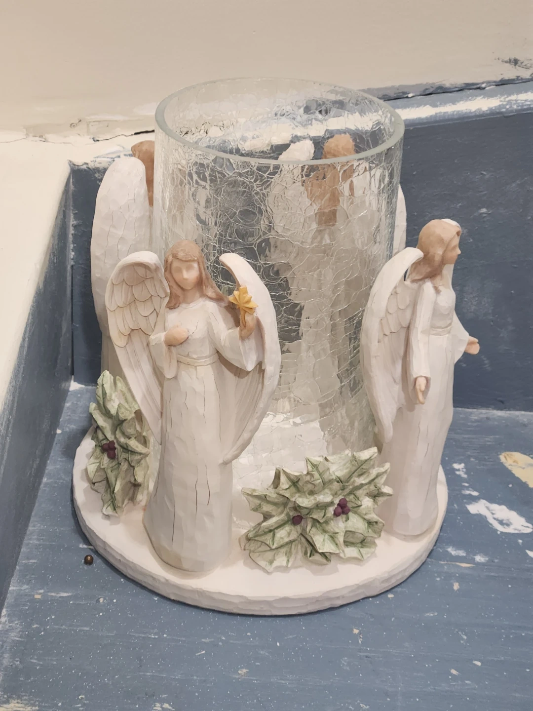 A lovely angel candle holder featuring three angels surrounding a crackled glass votive holder, adorned with holly accents. Perfect for adding a touch of serenity to any room