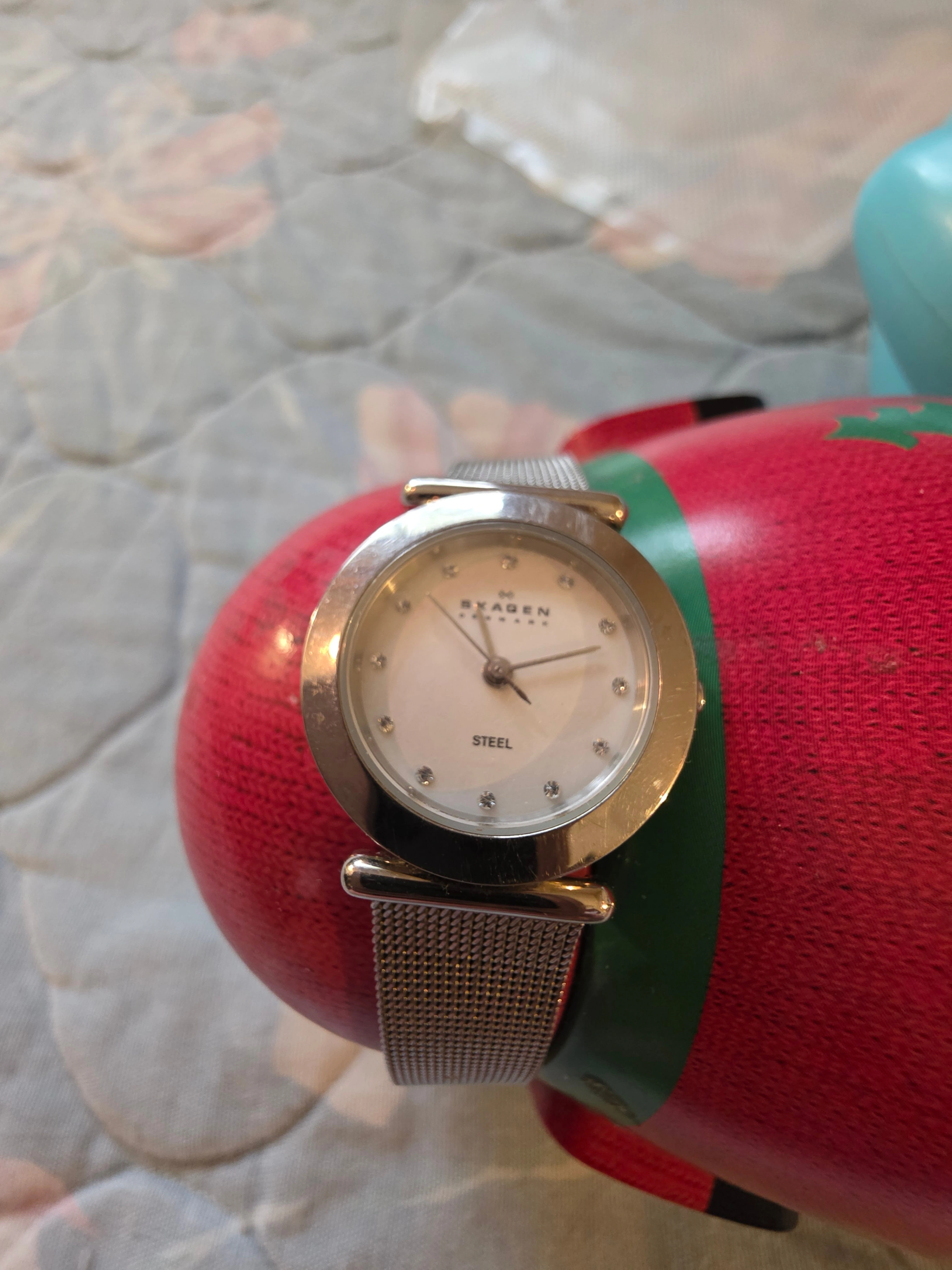 Selling a Skagen watch with a steel mesh band. It's in good condition and ready for a new home! The watch face is a clean, minimalist design that goes with everything. All it requires is a new battery.