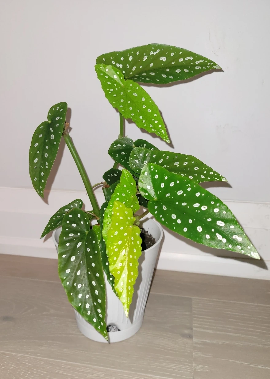 Selling this healthy and beautiful Polka Dot Begonia for only $5. The plant is about 10" including the sturdy white pot. Leaves are pretty and cute. Very easy to grow. Might flower in the Summer/Fall depending on the growing environment.