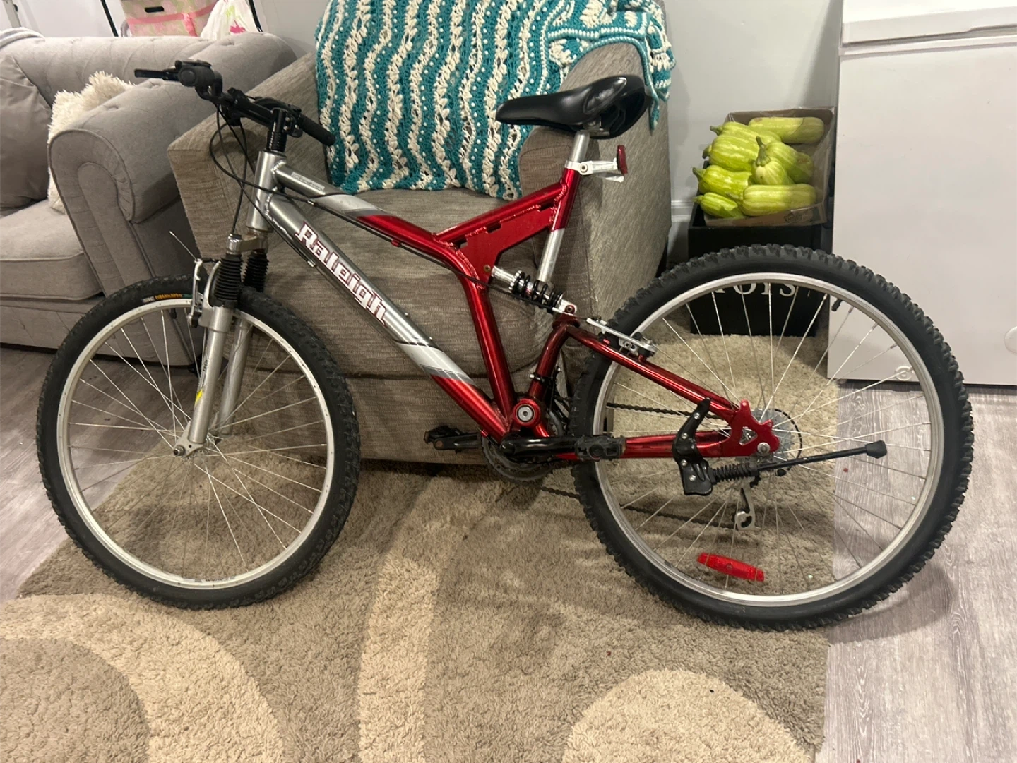Selling a Raleigh mountain bike with full suspension. It's in good condition and ready for some trails or just cruising around the neighbourhood! The frame is a striking red and silver colour.