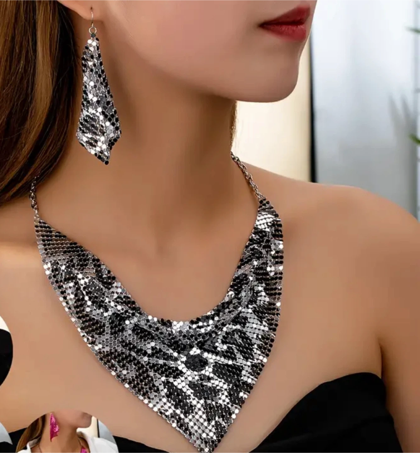 This is a beautiful statement necklace and earrings set. The set is silver and black in colour and made of metal. Perfect for dressing up any outfit!