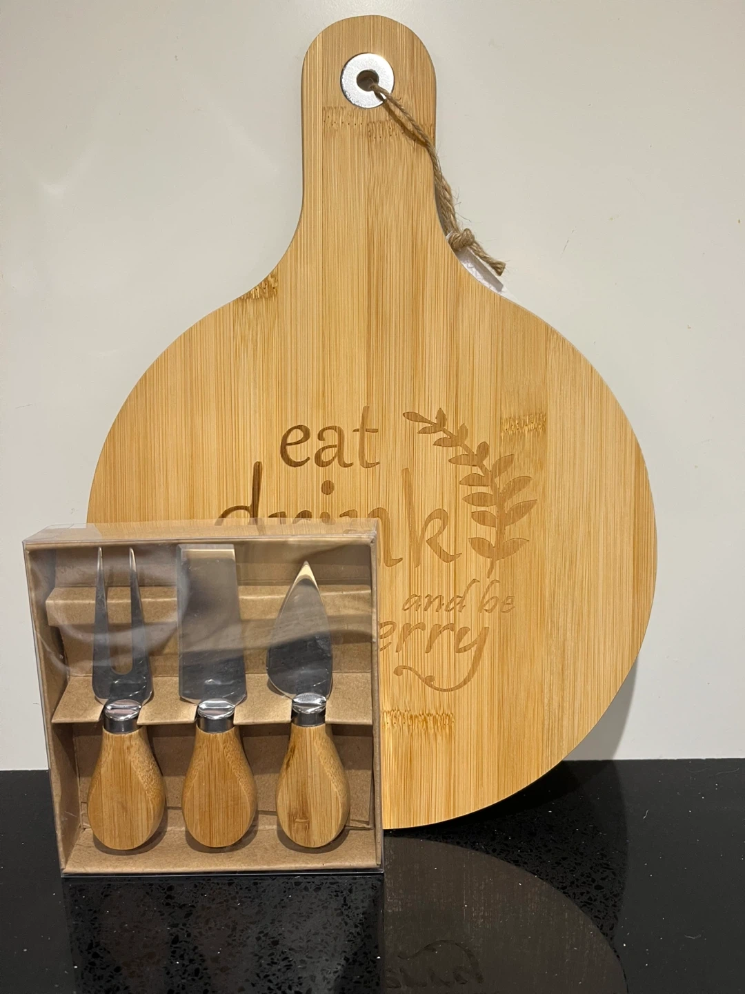 Selling a cute bamboo cheese board set! It comes with three cheese knives still in their original packaging. The board has an adorable 'eat, drink and be merry' engraving. Perfect for your next get-together or a thoughtful gift for a cheese lover. BRAND NEW