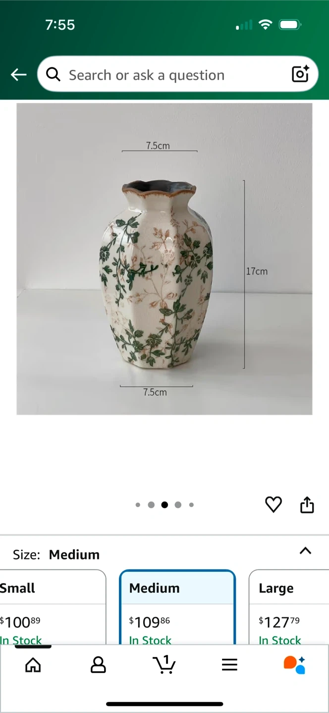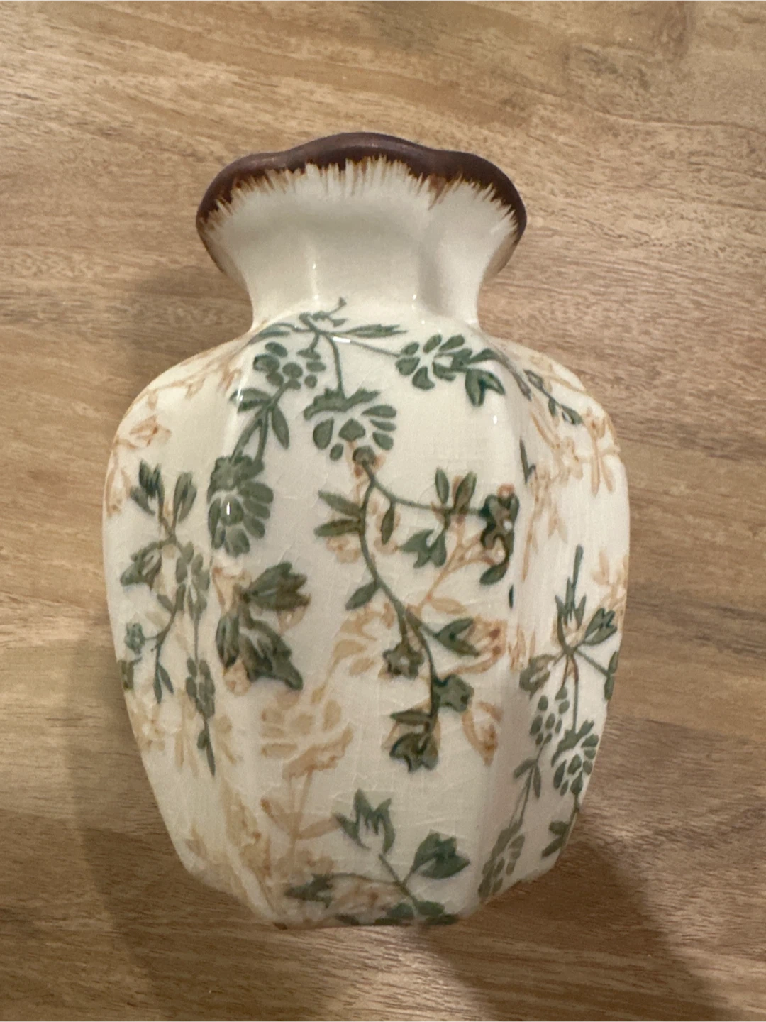 71Here's a lovely floral patterned vase! It's a medium size and would look great as a centrepiece or decorative touch in any room. The vase has a unique design with green and beige floral patterns on a white background, and a brown rim. It measures approximately 17cm in height and 7.5cm in width.