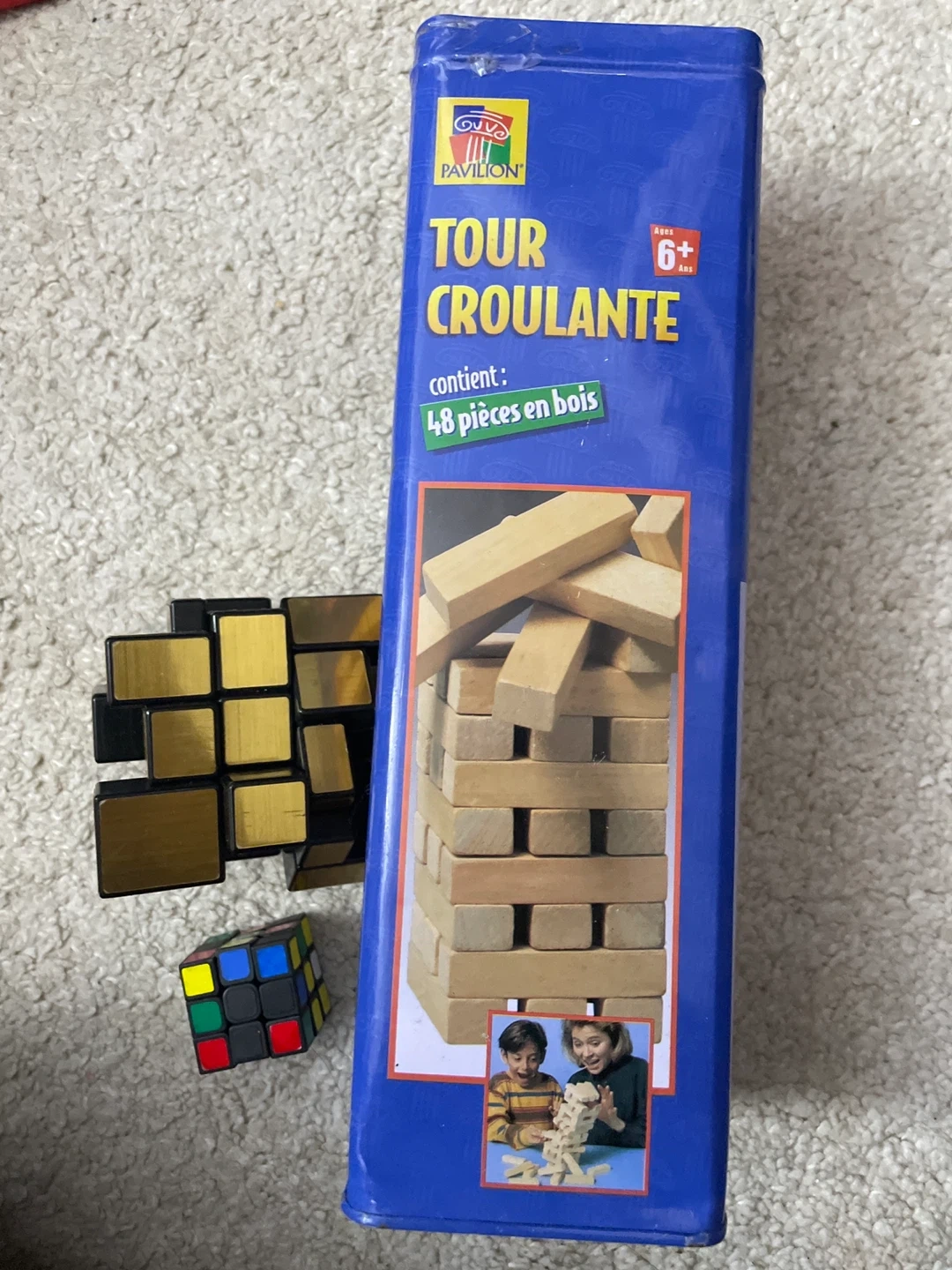 Selling a Pavilion Tour Croulante stacking game, suitable for ages 6+. It contains 48 wooden pieces for fun and challenging play. The box is included!