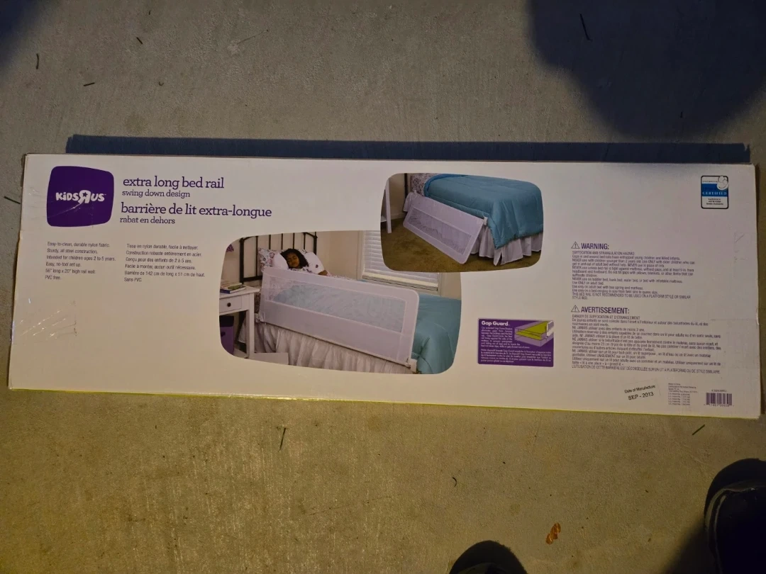 Selling a Kids R Us extra long bed rail with a swing down design. It's easy to clean and made with durable nylon fabric and sturdy steel construction. Intended for children ages 2 to 5 years. The rail is 56 inches long and 20 inches high. The manufacturing date is September 2013