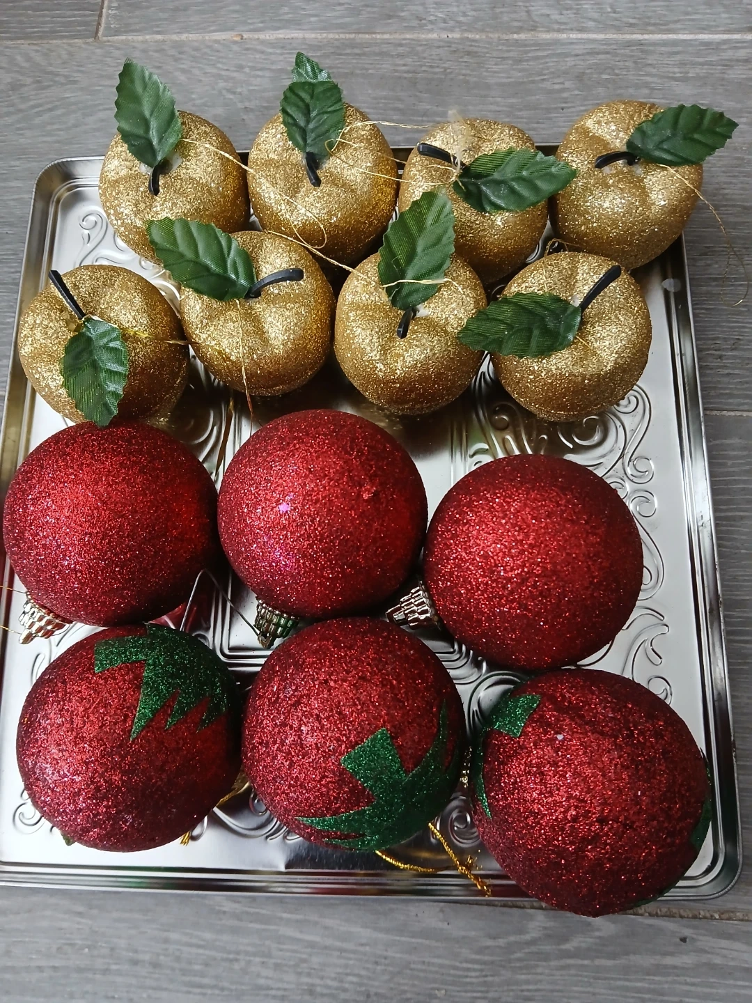 Selling a set of Christmas tree ornaments! There are gold apple-shaped ornaments and red round ornaments, some with green leaf designs. They're perfect for adding a festive touch to your holiday decor.