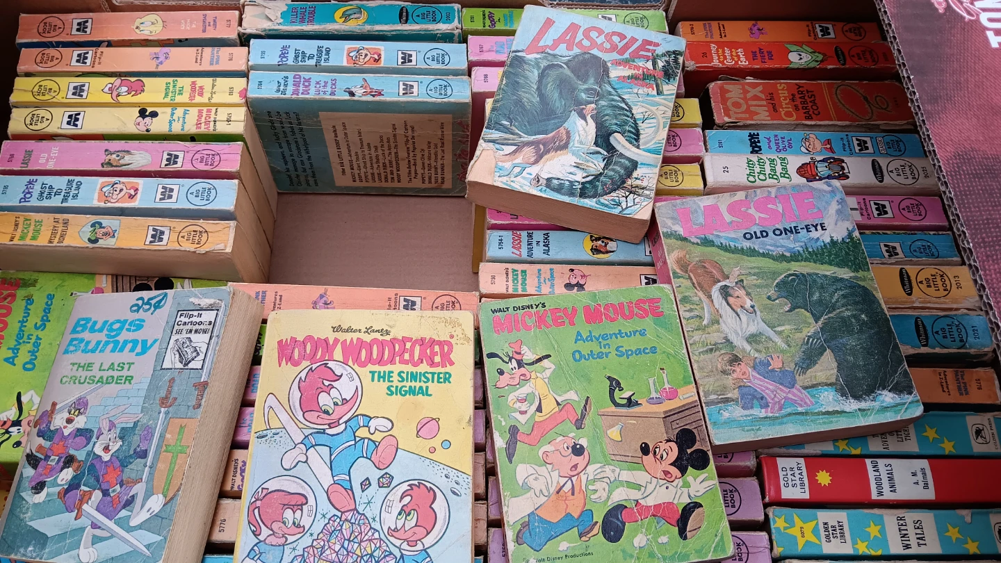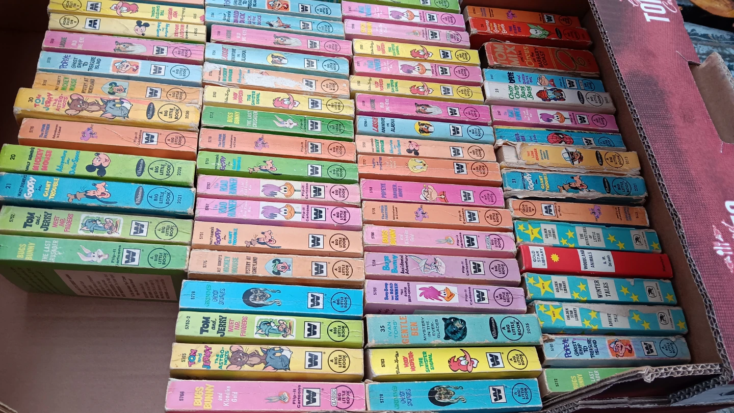 Selling a collection of vintage big little books. These books feature classic characters like Mickey Mouse, Bugs Bunny, Tom and Jerry, and Lassie. They're in various conditions for their age, perfect for collectors or anyone looking for a nostalgic read