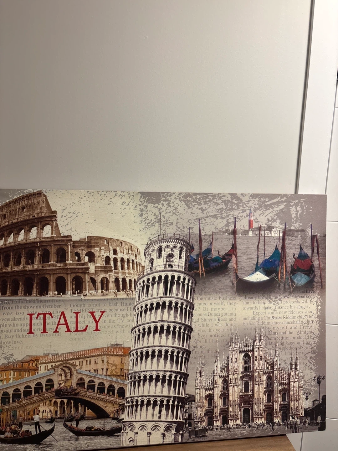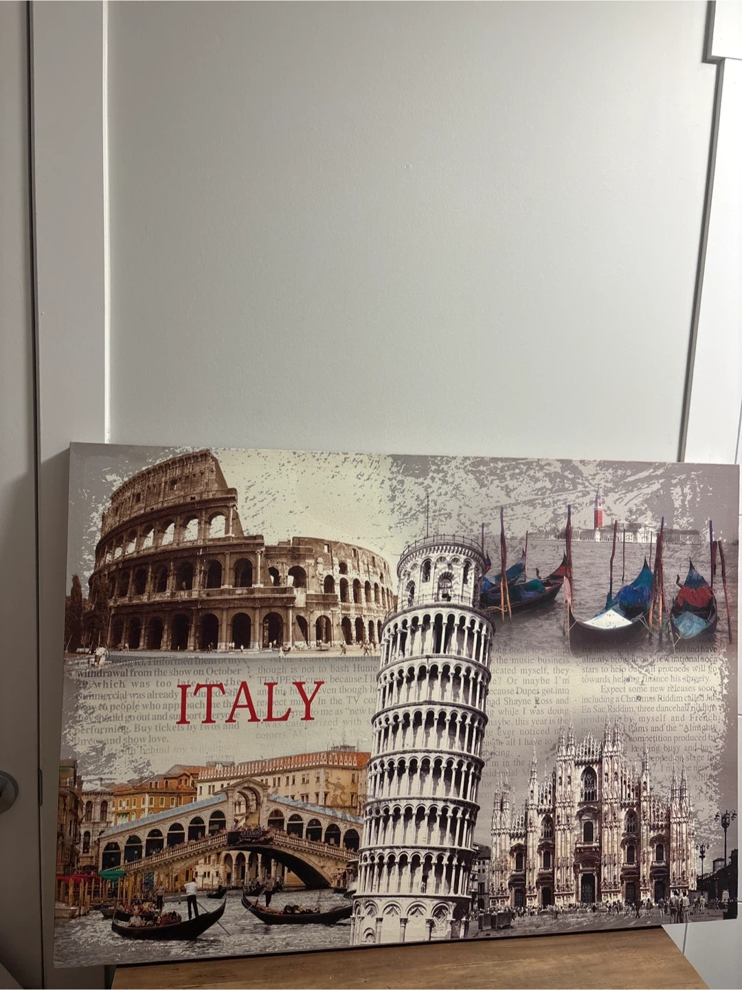 Here's a lovely canvas print featuring iconic Italian landmarks like the Colosseum, the Leaning Tower of Pisa, and the canals of Venice. It would be a great addition to any room!