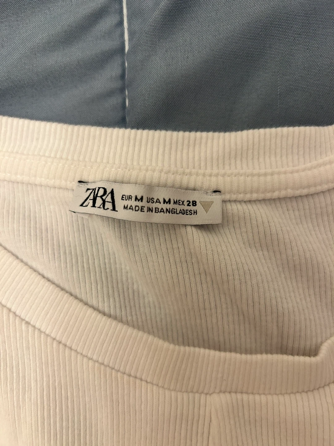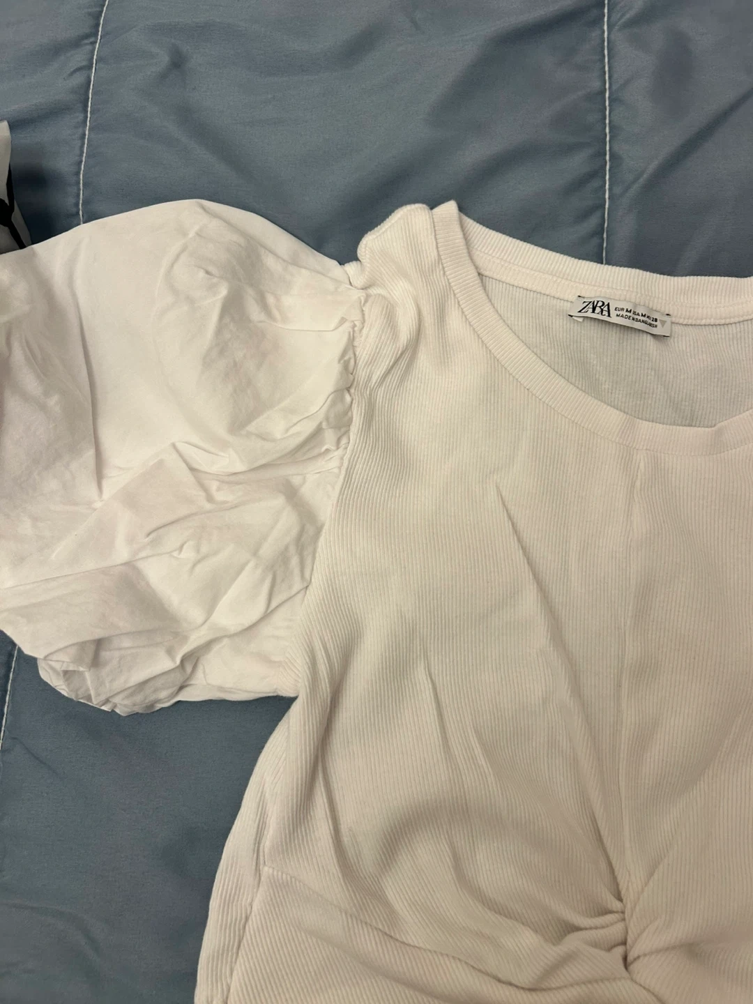 Cute Zara top with puff sleeves! It's a size medium and in great condition. The material is soft and comfortable, perfect for a casual day out. It has a stylish knot detail at the front.