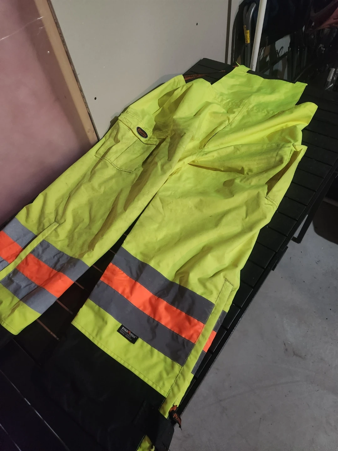Selling a pair of Pioneer hi-visibility rain pants in size 2XL. These pants are designed with CSA Z96-15 Class 3 Level 2 compliance, ensuring top-notch safety and visibility on the job. They're perfect for anyone needing reliable rain protection while working outdoors