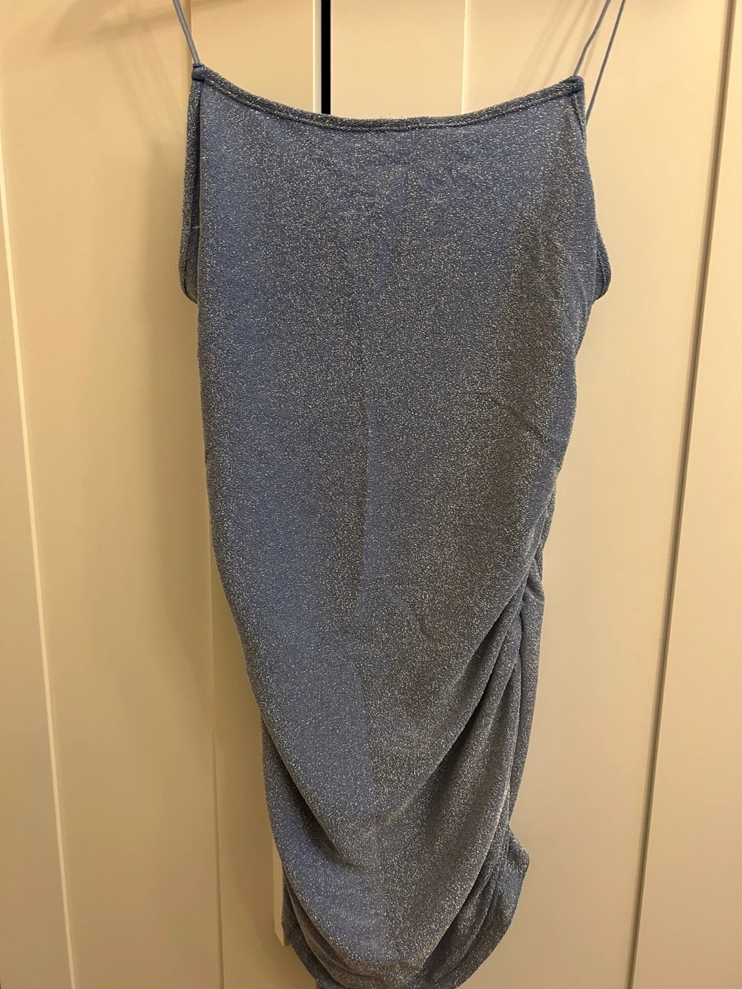 Here’s a cute blue dress with a subtle sparkle! It would be perfect for a night out or a special occasion. The material is soft and comfortable, and the dress is in great condition