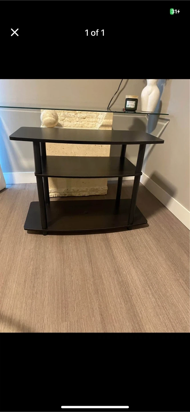 Selling a black TV stand with three shelves. It's in great shape! width of top and bottom shelf are 32 inch across. 14inch height from first shelf to second and second shelf to top is 8inch in height. Floor to top of stand is 22 and half inches
