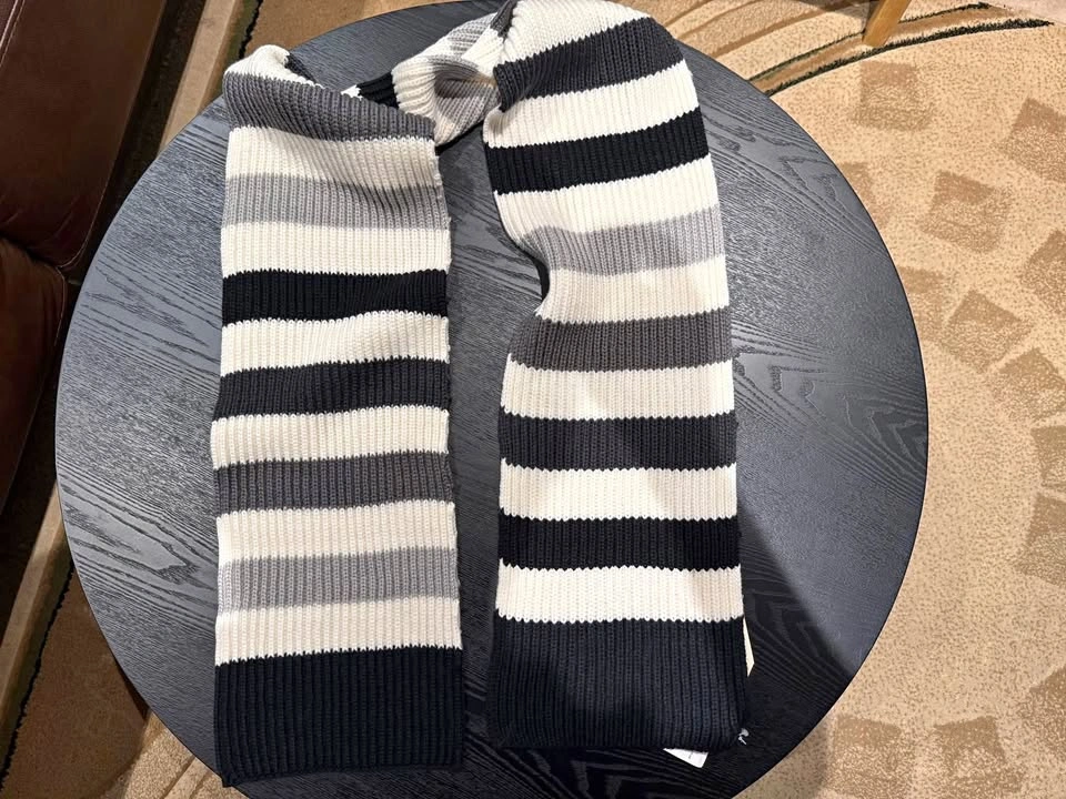 Elevate your style with this elegant striped scarf. Featuring a classic combination of black, gray, and white, it's perfect for any occasion.
