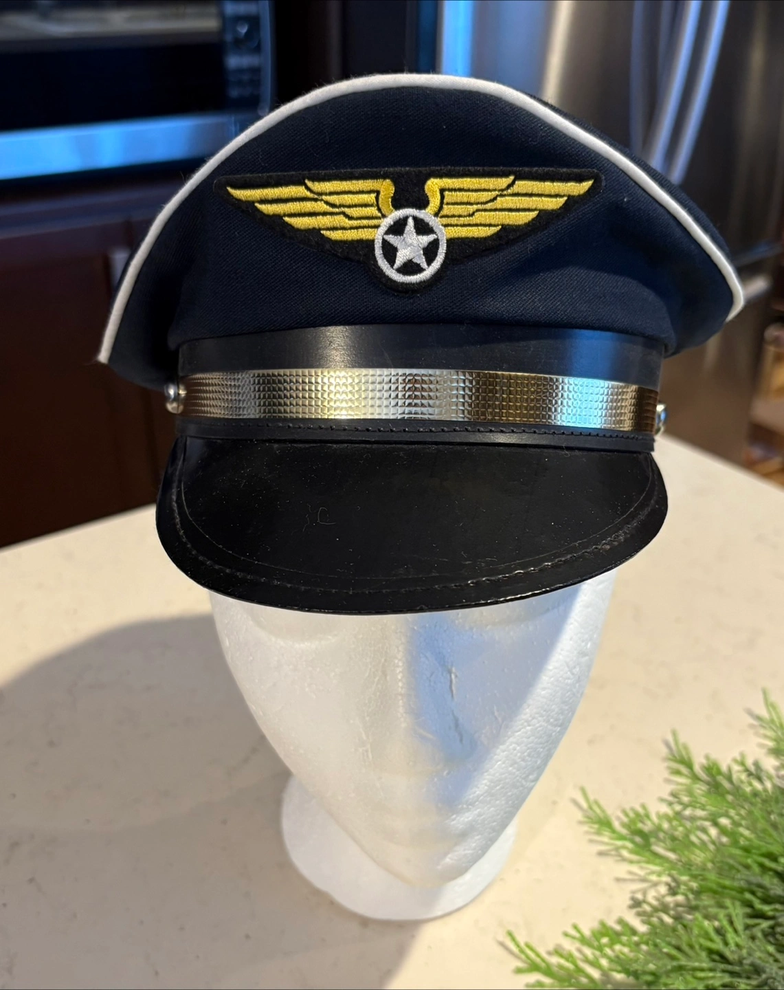 Pilot costume hat in new condition! It features a distinctive emblem and a shiny band. Inside 8” x 6”