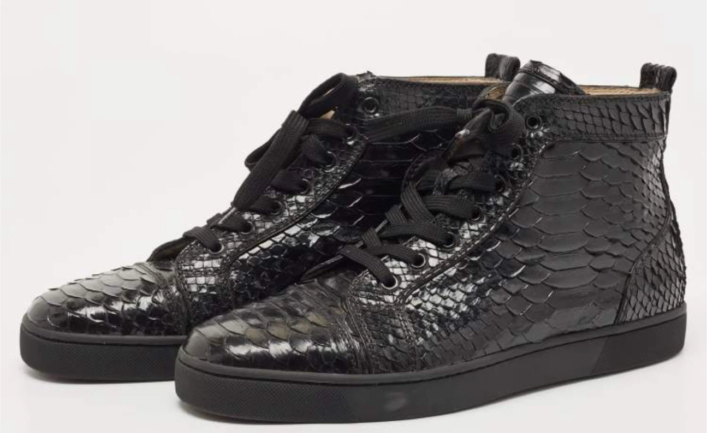 Selling a pair of Christian Louboutin high-top sneakers. These are a striking black colour with a unique python skin texture.