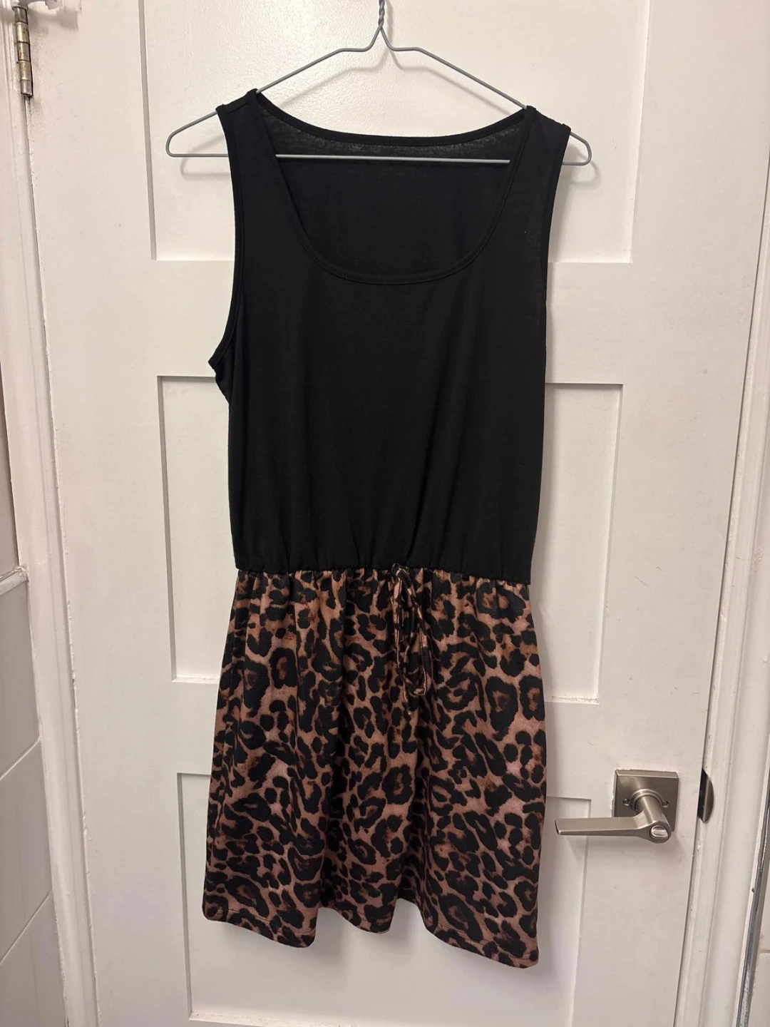631Cute dress with a black top and leopard print bottom. It has a drawstring waist. Perfect for a casual day out!
