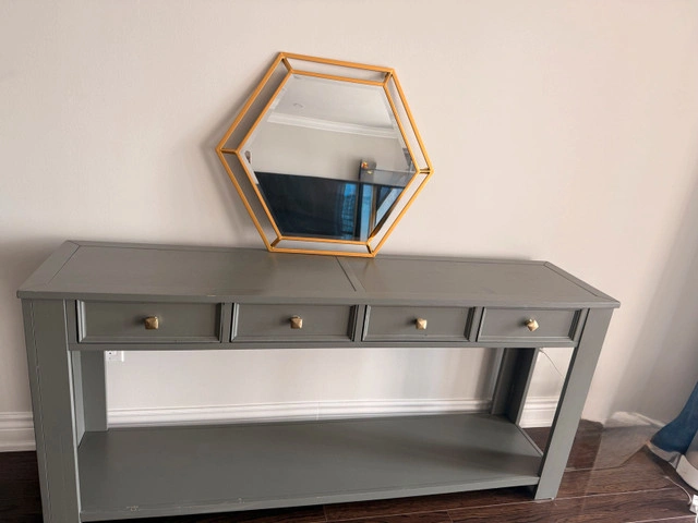 Add a touch of geometric elegance to your space with this used Hexagon Mirror, perfect for adding light and style to any room. The mirror features a unique hexagonal shape with a gold-tone frame, making it a striking decorative piece. This mirror has been previously enjoyed and has some light wear, which only adds to its character. While I do not have specific dimensions for you, here's what makes this mirror special: * Unique Hexagon Shape * Stylish Gold-Tone Frame I'm pricing this mirror at $50, reflecting its used condition and stylish design and Kijiji listings for similar decorative mirrors, so I believe this is a fair price. If you're reading this, it's still available!