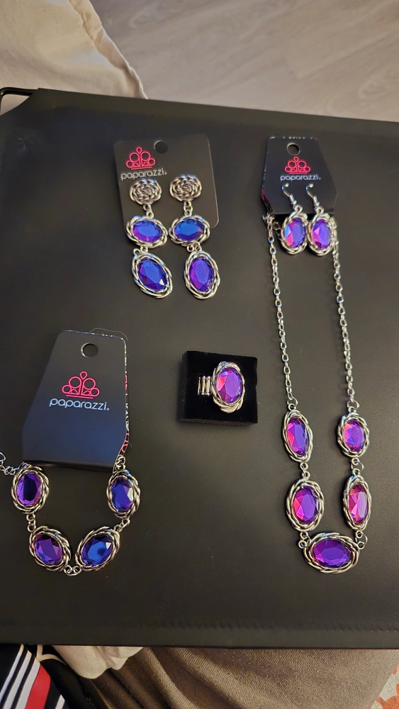Selling a beautiful Paparazzi jewelry set of 4! This set includes a necklace, earrings, a ring, and a bracelet, all featuring stunning purple and blue stones. Perfect for adding a pop of color to any outfit!