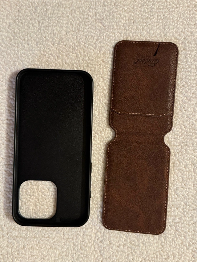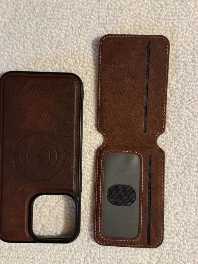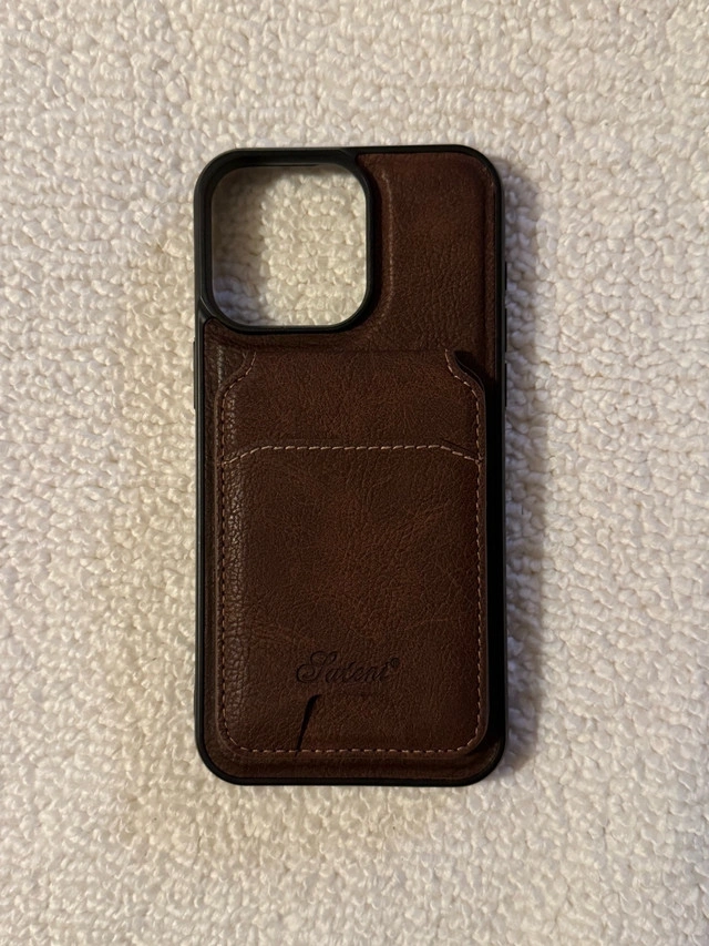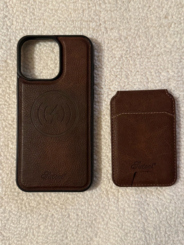 I'm selling a brown leather Statent wallet case with a detachable MagSafe wallet, designed specifically for the iPhone 15 Pro Max. This stylish case offers both protection and functionality, allowing you to carry your essential cards with your phone. Although it has been used, it remains in great shape.