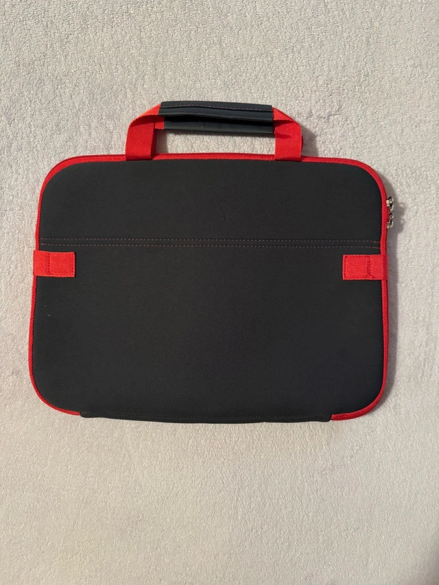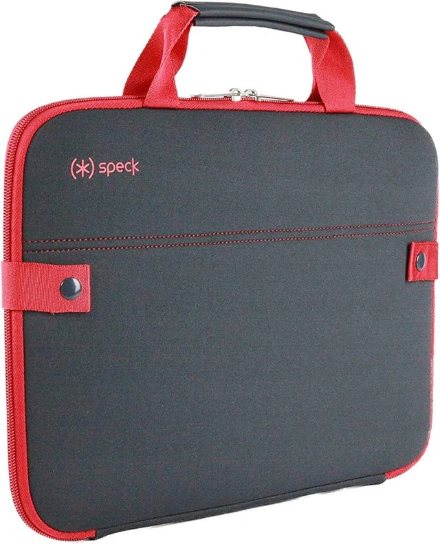 This is a black and red Speck laptop bag, perfect for 13-14 inch laptops. It's in great condition and has a padded interior to keep your device safe. It also features convenient carrying handles and a zippered closure.
