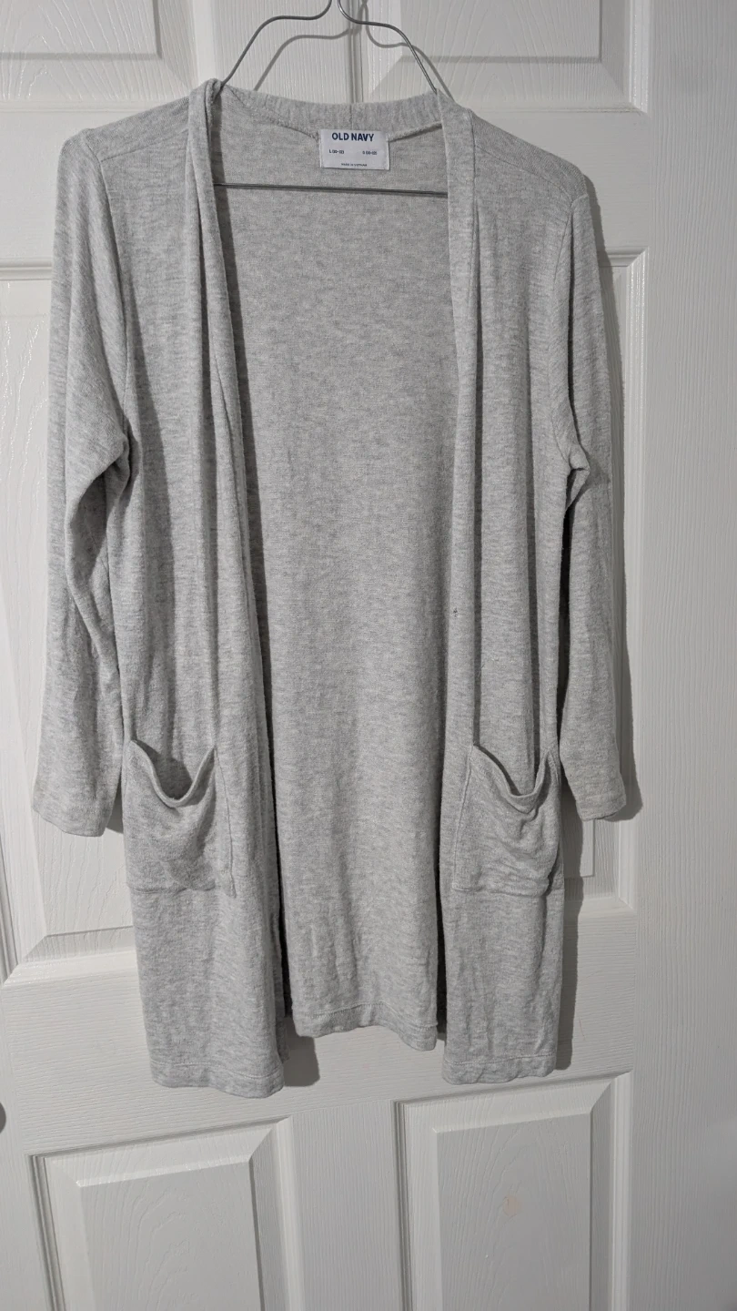 Selling a comfy grey cardigan from Old Navy in size medium. There is a hole in the cardigan, as shown in the photos